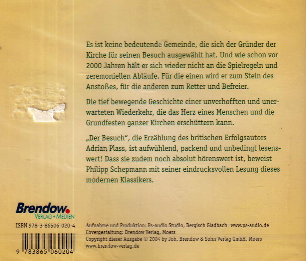 „Der Besuch“,die Erzählung des britischen Erfolgsautors Adrian Plass, ist aufwühlend, packend und unbedingt lesenswert! Dass sie zudem noch absolut hörenswert ist, beweist Philipp Schepmann mit seiner eindrucksvollen Lesung dieses modernen Klassikers.