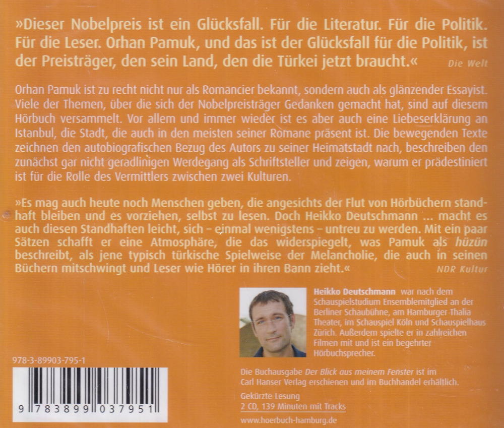 Viele der Themen, über die sich der Nobelpreisträger Gedanken gemacht hat, sind auf diesem Hörbuch versammelt. Vor allem und immer wieder ist es aber auch eine Liebeserklärung an Istanbul, die Stadt, die auch in den meisten seiner Romane präsent ist. Die bewegenden Texte zeichnen den autobiografischen Bezug des Autors zu seiner Heimatstadt nach, beschreiben den zunächst gar nicht geradlinigen Werdegang als Schriftsteller und zeigen, warum er prädestiniert ist für die Rolle des Vermittlers zwischen zwei Kulturen.