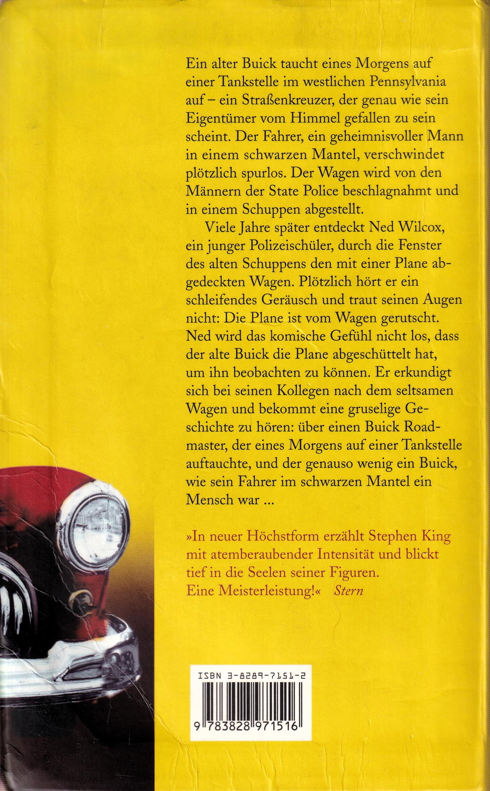 Ned wird das komische Gefühl nicht los, dass der alte Buick die Plane abgeschüttelt hat, um ihn beobachten zu können. Er erkundigt sich bei seinen Kollegen nach dem seltsamen Wagen und bekommt eine gruselige Geschichte zu hören: über einen Buick Roadmaster, der eines Morgens auf einer Tankstelle auftauchte, und der genauso wenig ein Buick, wie sein Fahrer im schwarzen Mantel ein Mensch war.