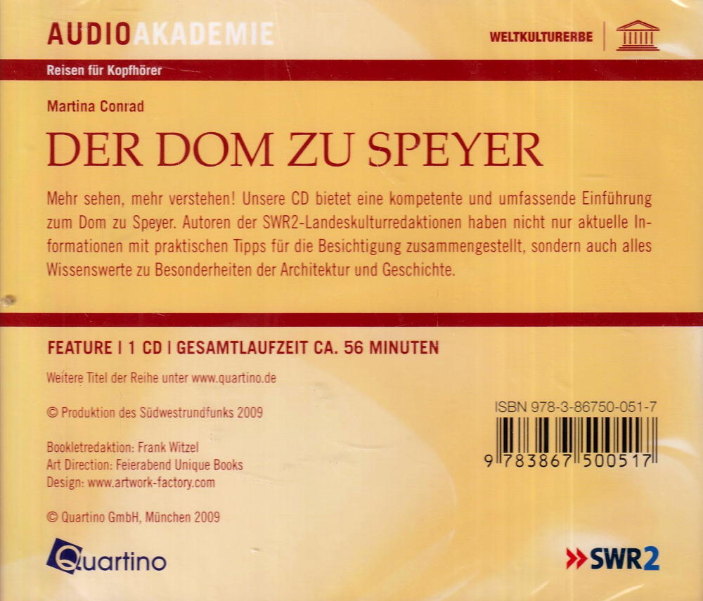 Mehr sehen, mehr verstehen! Unsere CD bietet eine kompetente und umfassende Einführung zum Dom zu Speyer. Autoren der SWR2-Landeskulturredaktionen haben nicht nur aktuelle Informationen mit praktischen Tipps für die Besichtigung zusammengestellt, sondern auch alles Wissenswerte zu Besonderheiten der Architektur und Geschichte.