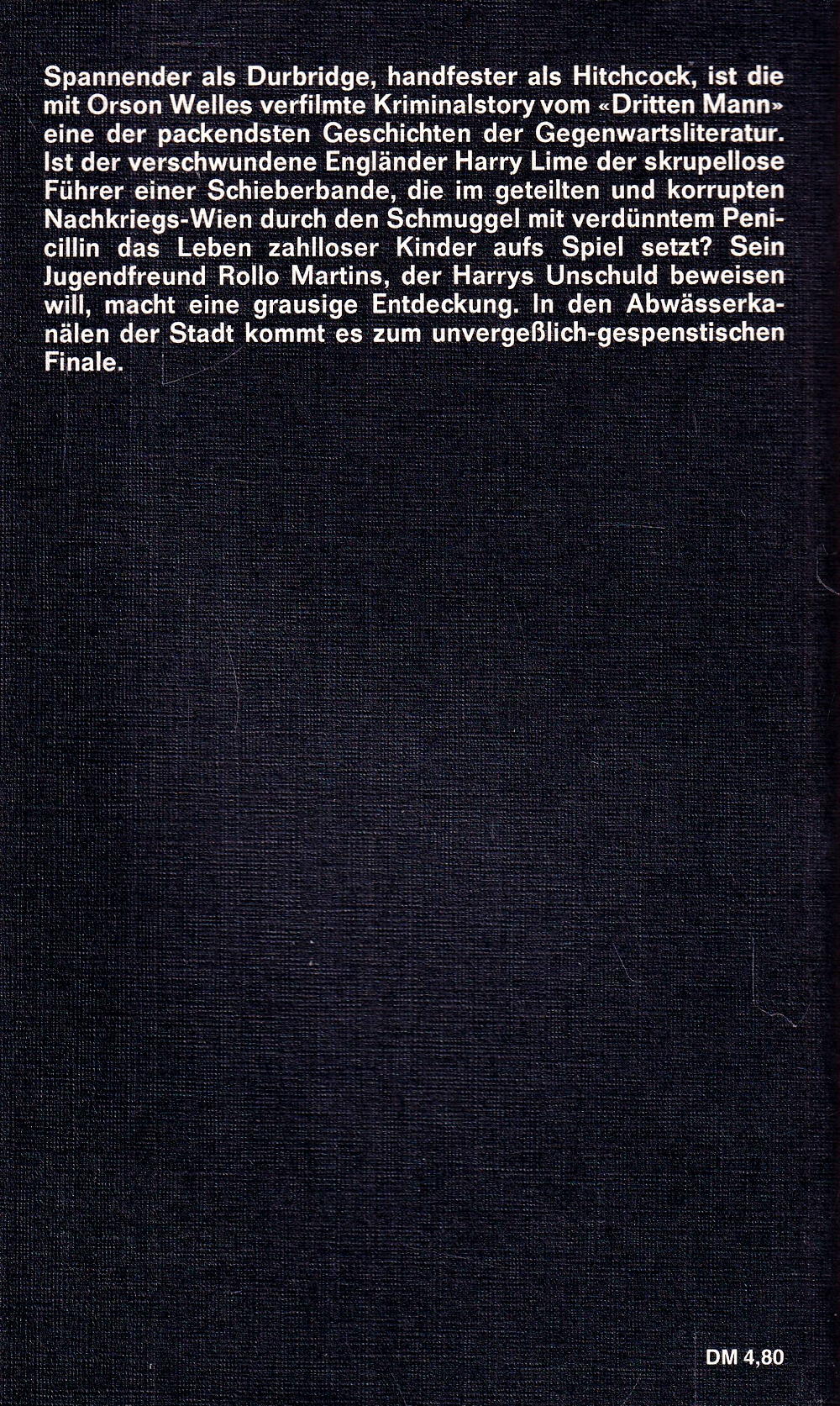 Spannender als Durbridge, handfester als Hitchcock, ist die mit Orson Welles verfilmte Kriminalstory vom «Dritten Mann» eine der packendsten Geschichten der Gegenwartsliteratur.