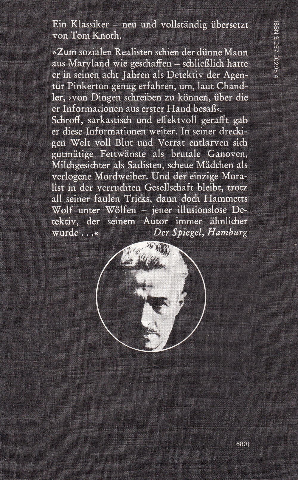 Dashiell Hammett, geboren 1894 in St. Mary's County (Maryland), verliess die Schule mit vierzehn Jahren, um mit Gelegenheitsarbeiten die Familie zu unterstützen. Danach arbeitete er acht Jahre lang in der berühmten Pinkerton National Detective Agency. Im Ersten Weltkrieg diente er in einem Sanitätskorps und erkrankte an Tuberkulose. Ab 1922 freier Schriftsteller und erfolgreicher Drehbuchschreiber. Dashiell Hammett starb 1961 in New York.