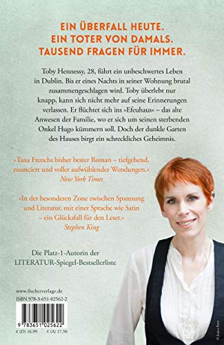 Identität, Erinnerung und Mord: der neue grosse Roman der SPIEGEL-Bestseller-Autorin. Toby Hennessy, 28, führt ein unbeschwertes Leben in Dublin. Bis er eines Nachts in seiner Wohnung brutal zusammengeschlagen wird. Toby überlebt nur knapp, kann sich nicht mehr auf seine Erinnerungen verlassen. Er flüchtet sich in das »Efeuhaus« – das alte Anwesen der Familie, wo er sich um seinen sterbenden Onkel Hugo kümmern soll. Doch der dunkle Garten des Hauses birgt ein schreckliches Geheimnis. »In der besonderen Zone zwischen Spannung und Literatur, mit einer Sprache wie Satin, ein Glücksfall für den Leser.