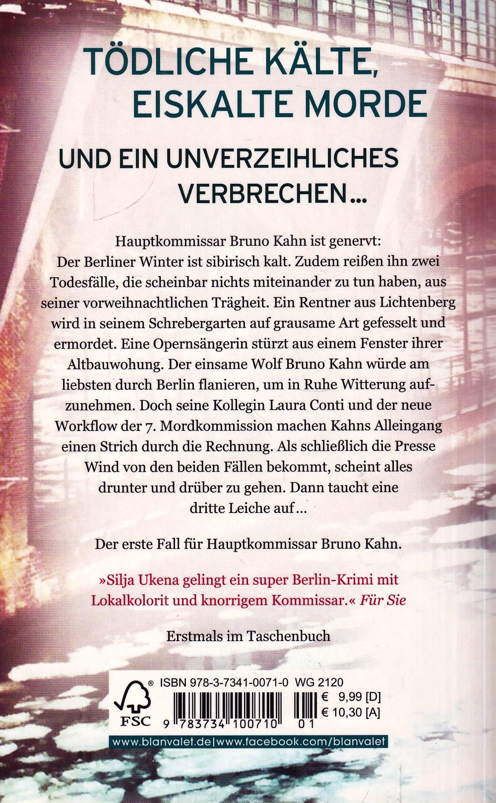 Hauptkommissar Bruno Kahn ist genervt: Der Berliner Winter ist sibirisch kalt. Zudem reissen ihn zwei Todesfälle aus seiner vorweihnachtlichen Trägheit: Ein Rentner aus Lichtenberg wird in seinem Schrebergarten grausam ermordet. Eine Opernsängerin stürzt aus ihrer Altbauwohnung. Der einsame Wolf Bruno Kahn würde am liebsten durch Berlin flanieren, um in Ruhe Witterung aufzunehmen. Doch seine Kollegin Laura Conti und der neue Workflow der 7. Mordkommission machen ihm einen Strich durch die Rechnung. Als schliesslich die Presse Wind bekommt, scheint alles drunter und drüber zu gehen. Dann taucht eine dritte Leiche auf ...