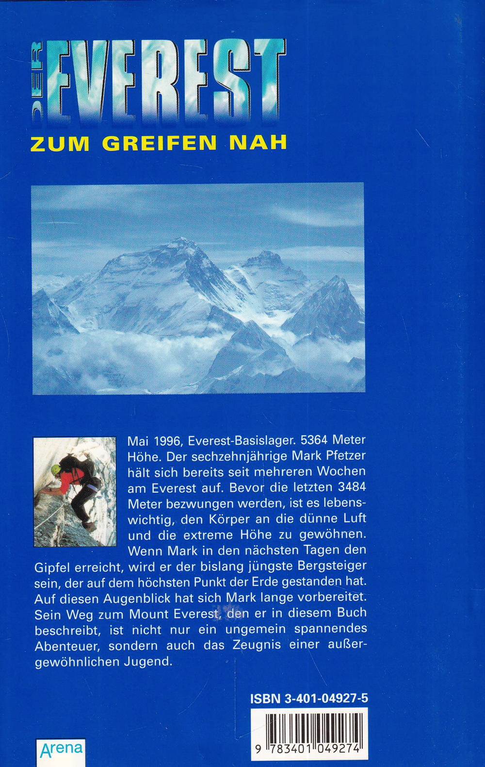 Bis zu seinem 13. Lebensjahr hatte der junge Amerikaner Mark Pfetzer keinen einzigen Berg gesehen. Sein Klettertraining absolvierte er in einer Kletterhalle auf Rhode Island. Eine Anzeige in dem Bergsteigermagazin Outside brachte Mark auf die Idee, den höchsten Gipfel dieser Erde, den Mount Everest, zu besteigen. Hier berichtet er über das abenteuerliche Unterfangen. (Ab 12 Jahren. )