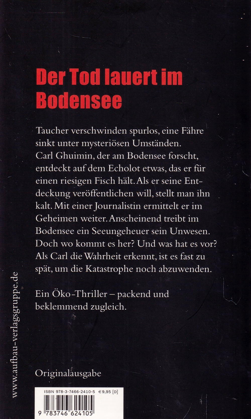 Taucher verschwinden spurlos, eine Fähre sinkt unter mysteriösen Umständen. Carl Ghuimin, der am Bodensee forscht, entdeckt auf dem Echolot etwas, das er für einen riesigen Fisch hält. Als er seine Entdeckung veröffentlichen will, stellt man ihn kalt. Mit einer Journalistin ermittelt er im Geheimen weiter. Anscheinend treibt im Bodensee ein Seeungeheuer sein Unwesen. Doch wo kommt es her? Und was hat es vor? Als Carl die Wahrheit erkennt, ist es fast zu spät, um die Katastrophe noch abzuwenden. Ein Öko-Thriller - packend und beklemmend zugleich.