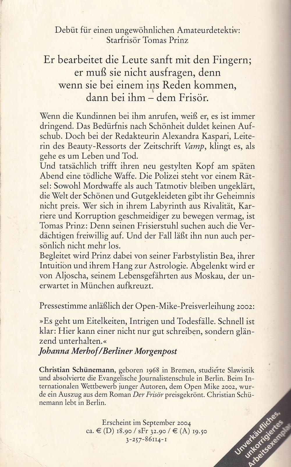 Er bearbeitet die Leute sanft mit den Fingern; muss sie nicht ausfragen, denn wenn sie bei einem ins Reden kommen, dann bei ihm - dem Frisör