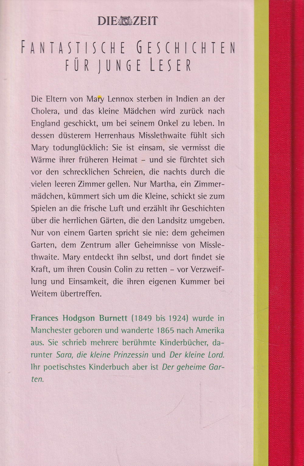 Nur von einem Garten spricht sie nie: dem geheimen Garten, dem Zentrum aller Geheimnisse von Misslethwaite. Mary entdeckt ihn selbst, und dort findet sie Kraft, um ihren Cousin Colin zu retten vor Verzweiflung und Einsamkeit, die ihren eigenen Kummer bei Weitem übertreffen.