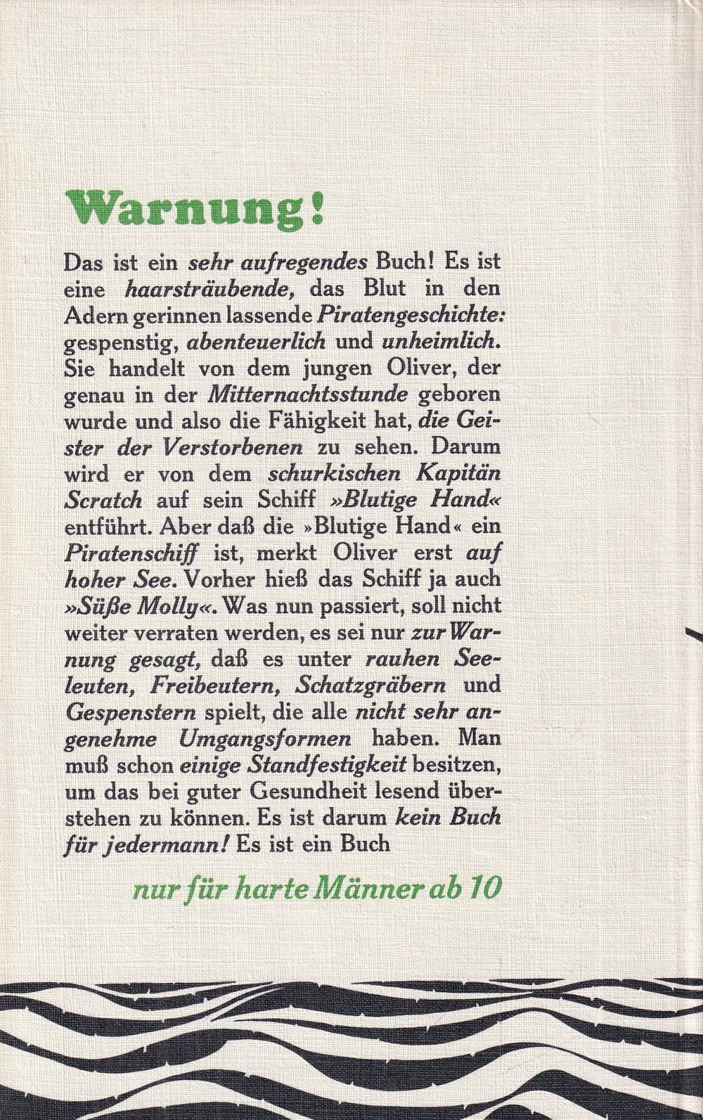 entführt. Aber dass die »Blutige Hand« ein Piratenschiff ist, merkt Oliver erst auf hoher See. Vorher hiess das Schiff ja auch »Süsse Molly«. Was nun passiert, soll nicht weiter verraten werden, es sei nur zur Warnung gesagt, dass es unter rauhen Seeleuten, Freibeutern, Schatzgräbern und Gespenstern spielt, die alle nicht sehr angenehme Umgangsformen haben. Man muss schon einige Standfestigkeit besitzen, um das bei guter Gesundheit lesend überstehen zu können. Es ist darum kein Buch für jedermann! Es ist ein Buch