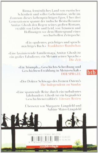 Faszinierende Familiensaga und dramatische Liebesgeschichte in einem, das ist der neue Roman von Amitav Gosh. Der Doktor Schiwago des Fernen Osten (INDEPENDENT ON SUNDAY) fand mit seinem farbenprächtigen Epos über Liebe und Krieg in einem exotischen Land auf der ganzen Welt begeisterte Leser und war auch bei den Kritikern ein Riesenerfolg. Dieser erste grosse Roman über das geheimnisumwitterte Birma erzählt die Geschichte des jungen Rajkumar, der in einer Imbissbude auf dem Markt von Mandalay 1885 Zeuge des Einmarsches der britischen Truppen wird. Entsetzt beobachtet er die Plünderung des Glaspalastes und muss mit ansehen, wie die Königsfamilie ins Exil gejagt wird. Im Gefolge sieht er die Dienerin Dolly und ist von ihrer Schönheit so bezaubert, dass er ihr Gesicht nie mehr vergisst...