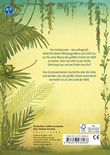 Eine herzerwärmende Geschichte darüber, dass ein Schatz nicht immer aus Gold sein mussEin Geschenkbuch der besonderen Art mit zeitloser BotschaftUnverwechselbare, stimmungsvolle IllustrationenDer kleine Affenjunge Mono möchte für seine Mama den grössten Schatz der Welt finden. Den ganzen Tag ist er im Dschungel unterwegs und trifft dabei viele fremde Tiere. Aber einen Schatz findet er nicht. Als es nach einem aufregenden Tag schnell dunkel wird, wartet seine Mama schon sehnsüchtig auf ihren grössten Schatz...