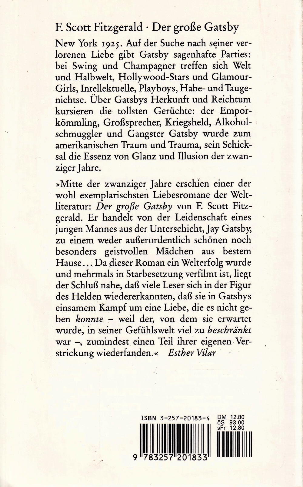 Da dieser Roman ein Welterfolg wurde und mehrmals in Starbesetzung verfilmt ist, liegt der Schluss nahe, dass viele Leser sich in der Figur des Helden wiedererkannten, dass sie in Gatsbys einsamem Kampf um eine Liebe, die es nicht geben konnte - weil der, von dem sie erwartet wurde, in seiner Gefühlswelt viel zu beschränkt war, zumindest ein Teil ihrer eigenen Verstrickung wiederfanden. Esther Vilar