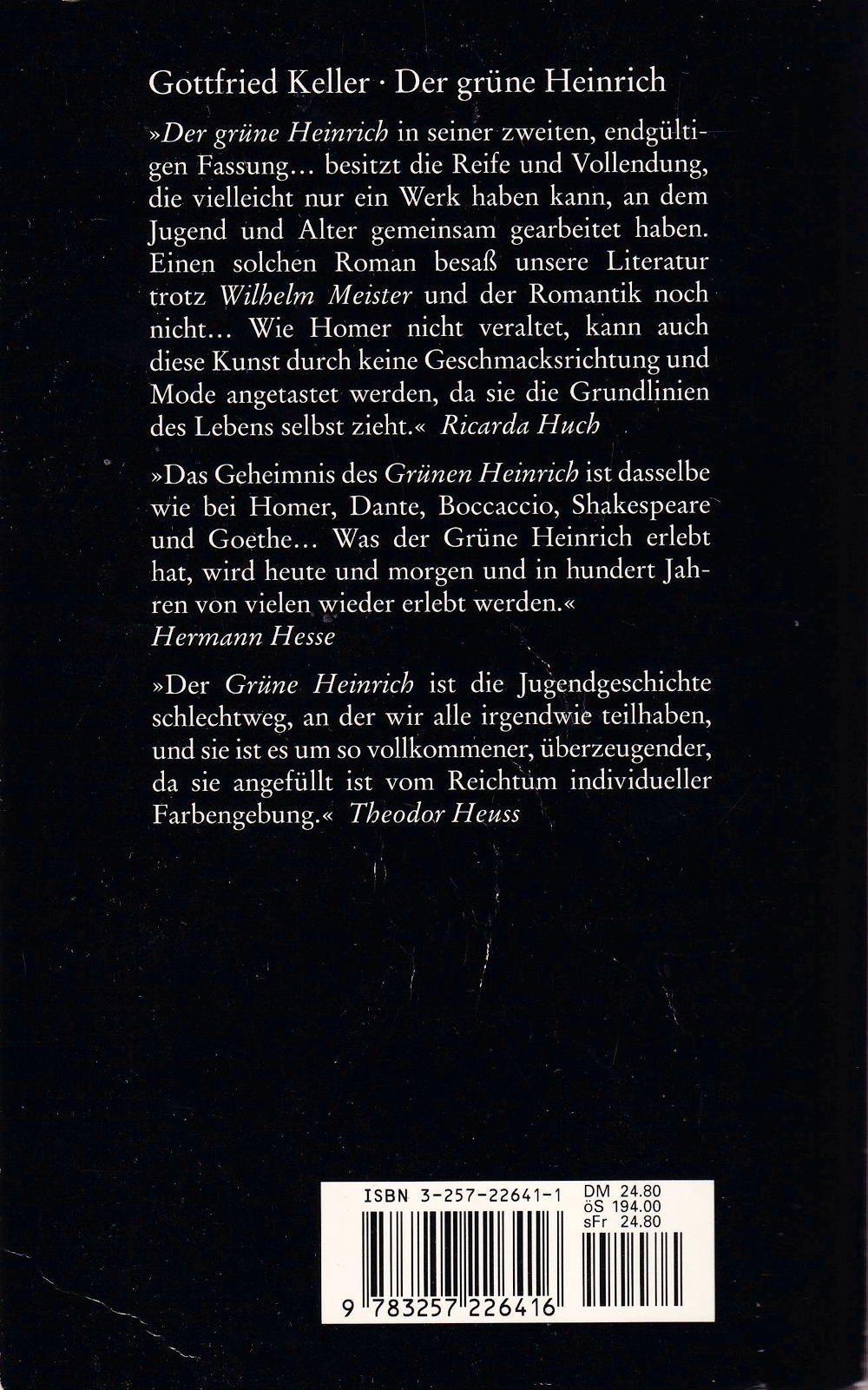 Der grüne Heinrich in seiner zweiten, endgültigen Fassung besitzt die Reife und Vollendung, die vielleicht nur ein Werk haben kann, an dem Jugend und Alter gemeinsam gearbeitet haben. Einen solchen Roman besass unsere Literatur trotz Wilhelm Meister und der Romantik noch nicht. Ein Leben läuft ab, aus altem, ansässigem Bauernvolk hervorgegangen, in die bewegliche Stadt versetzt, von dem Strome des geordneten Staatswesens aufgenommen und weitergetragen, bis die eigenen Schicksalstriebe sich regen, die es mit wechselnder Bewegung, bald müssig schlängelnd, bald mit starkem Stoss und stürzend, durch Irrtum und Kampf, hart am unteren Untergang vorüber, zu versöhnter, doch schmerzvoller Klarheit führen. Wie Homer nicht veraltet, kann auch diese Kunst durch keine Geschmacksrichtung und Mode angetastet werden, da sie die Grundlinien des Lebens selbst zieht.