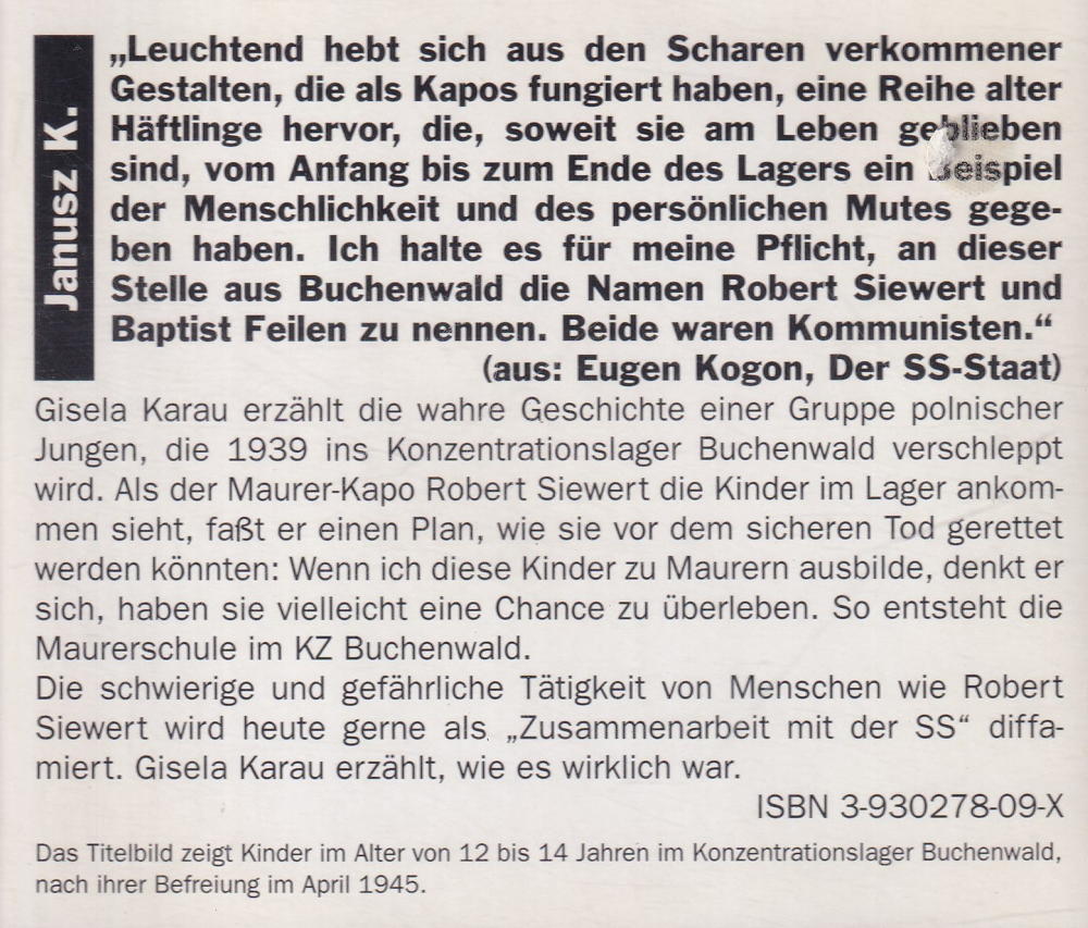 Gisela Karau erzählt die wahre Geschichte einer Gruppe polnischer Jungen, die 1939 ins Konzentrationslager Buchenwald verschleppt wird. Als der Maurer-Kapo Robert Siewert die Kinder im Lager ankommen sieht, fasst er einen Plan, wie sie vor dem sicheren Tod gerettet werden könnten: Wenn ich diese Kinder zu Maurern ausbilde, denkt er sich, haben sie vielleicht eine Chance zu überleben. So entsteht die Maurerschule im KZ Buchenwald.