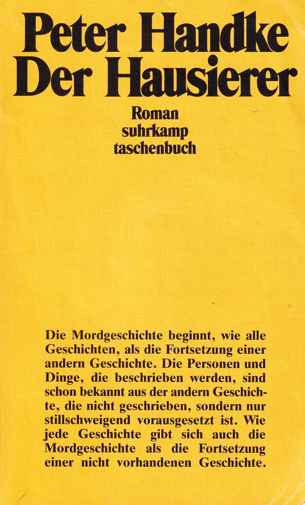 "Der Hausierer, nach den Hornissen Peter Handkes zweiter Roman, erschienen im Jahr 1967, ist ein Kriminalroman nach allen Regeln dieses Genres, eine 'Mordgeschichte', die alle möglichen Mordgeschichten zusammenfasst. Jeder Satz ist eine Geschichte. Der Held ist der 'Hausierer'; er beobachtet alles, er registriert die kleinsten Ereignisse, er ist der Zeuge, der überall dabei ist."