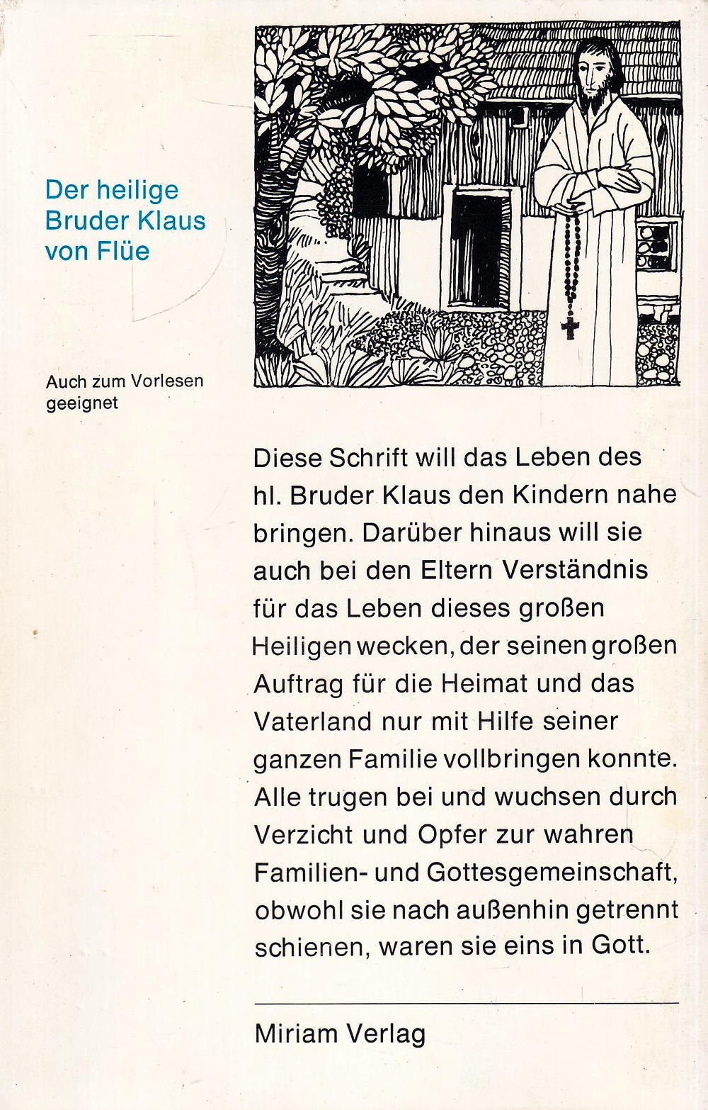 Diese Schrift will das Leben des hl. Bruder Klaus den Kindern nahe bringen. Darüber hinaus will sie auch bei den Eltern Verständnis für das Leben dieses grossen Heiligen wecken, der seinen grossen Auftrag für die Heimat und das Vaterland nur mit Hilfe seiner ganzen Familie vollbringen konnte.