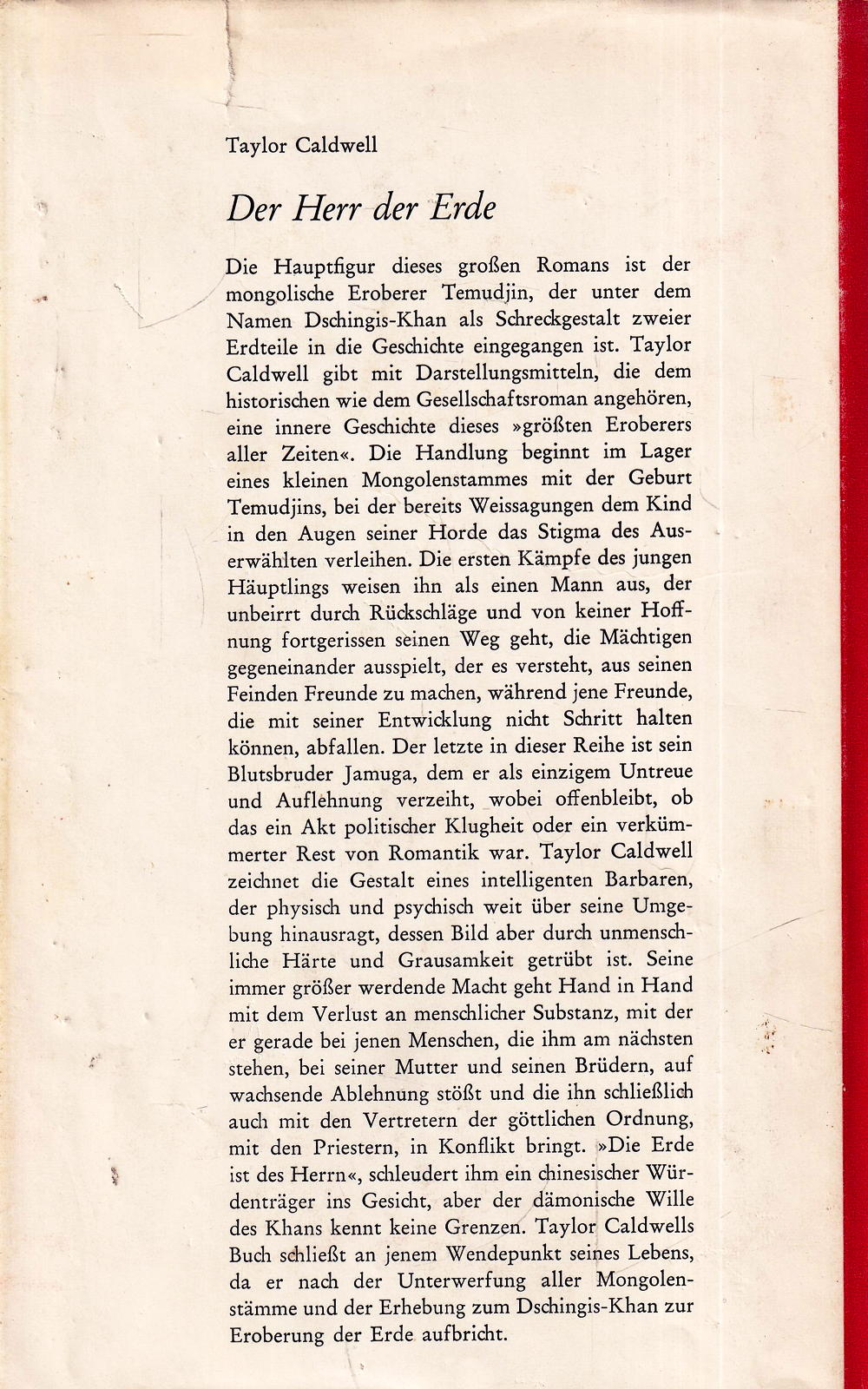 Die Hauptfigur dieses grossen Romans ist der mongolische Eroberer Temudjin, der unter dem Namen Dschingis-Khan als Schreckgestalt zweier Erdteile in die Geschichte eingegangen ist. Taylor Caldwell gibt mit Darstellungsmitteln, die dem historischen wie dem Gesellschaftsroman angehören, eine innere Geschichte dieses »grössten Eroberers aller Zeiten«. Die Handlung beginnt im Lager eines kleinen Mongolenstammes mit der Geburt Temudjins, bei der bereits Weissagungen dem Kind in den Augen seiner Horde das Stigma des Auserwählten verleihen. Die ersten Kämpfe des jungen Häuptlings weisen ihn als einen Mann aus, der unbeirrt durch Rückschläge und von keiner Hoffnung fortgerissen seinen Weg geht, die Mächtigen gegeneinander ausspielt, der es versteht, aus seinen Feinden Freunde zu machen, während jene Freunde, die mit seiner Entwicklung nicht Schritt halten können, abfallen. Der letzte in dieser Reihe ist sein Blutsbruder Jamuga, dem er als einzigem Untreue und Auflehnung verzeiht, wobei offenbleibt, ob das ein Akt politischer Klugheit oder ein verkümmerter Rest von Romantik war. Taylor Caldwell zeichnet die Gestalt eines intelligenten Barbaren, der physisch und psychisch weit über seine Umgebung hinausragt, dessen Bild aber durch unmenschliche Härte und Grausamkeit getrübt ist. Seine immer grösser werdende Macht geht Hand in Hand mit dem Verlust an menschlicher Substanz, mit der er gerade bei jenen Menschen, die ihm am nächsten stehen, bei seiner Mutter und seinen Brüdern, auf wachsende Ablehnung stösst und die ihn schliesslich auch mit den Vertretern der göttlichen Ordnung, mit den Priestern, in Konflikt bringt. »Die Erde ist des Herrn«, schleudert ihm ein chinesischer Würdenträger ins Gesicht, aber der dämonische Wille des Khans kennt keine Grenzen. Taylor Caldwells Buch schliesst an jenem Wendepunkt seines Lebens, da er nach der Unterwerfung aller Mongolenstämme und der Erhebung zum Dschingis-Khan zur Eroberung der Erde aufbricht.