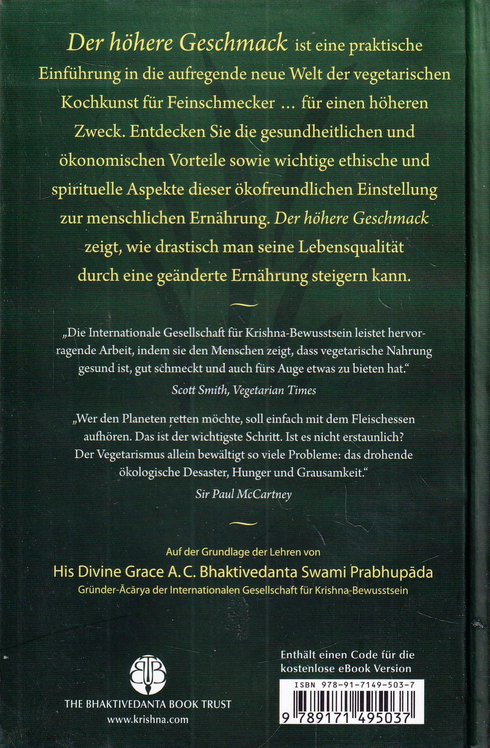 Der höhere Geschmack ist eine praktische Einführung in die aufregende neue Welt der vegetarischen Kochkunst für Feinschmecker für einen höheren Zweck. Entdecken Sie die gesundheitlichen und ökonomischen Vorteile sowie wichtige ethische und spirituelle Aspekte dieser ökofreundlichen Einstellung zur menschlichen Ernährung. Der höhere Geschmack zeigt, wie drastisch man seine Lebensqualität durch eine geänderte Ernährung steigern kann. Mit 55 berühmten Rezepten von Kurma Das, einem der berühmtesten vegetarischen Köche der Welt. Ausführliche Darstellung der Vorteile einer vegetarischen Ernährung.