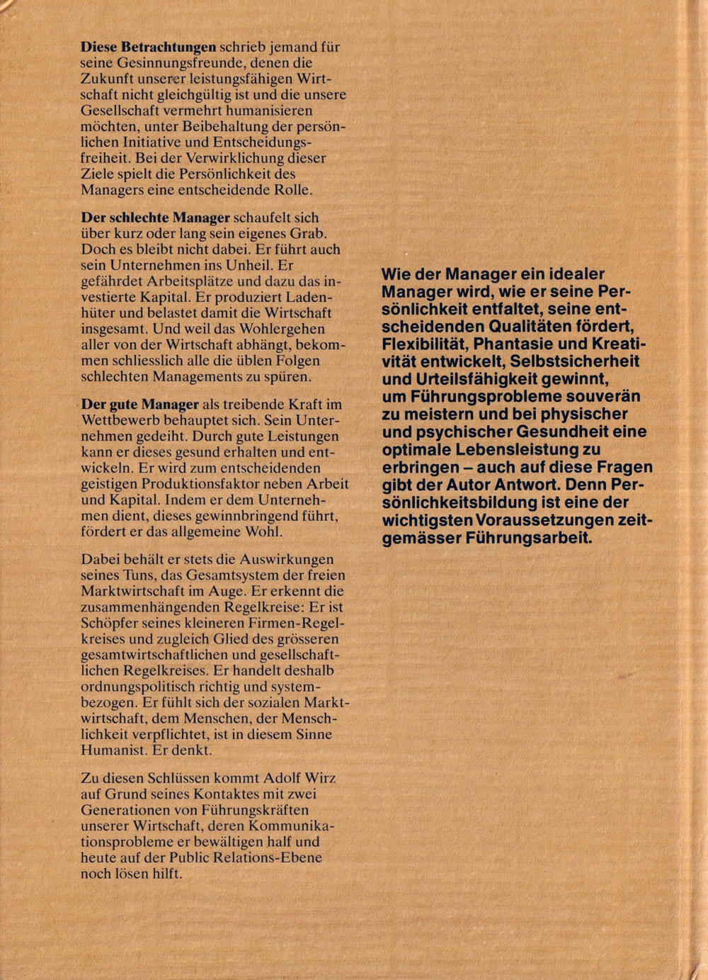 Wie der Manager ein idealer Manager wird, wie er seine Persönlichkeit entfaltet, seine entscheidenden Qualitäten fördert, Flexibilität, Phantasie und Kreativität entwickelt, Selbstsicherheit und Urteilsfähigkeit gewinnt, um Führungsprobleme souverän zu meistern und bei physischer und psychischer Gesundheit eine optimale Lebensleistung zu erbringen - auch auf diese Fragen gibt der Autor Antwort. Denn Persönlichkeitsbildung ist eine der wichtigsten Voraussetzungen zeitgemässer Führungsarbeit.