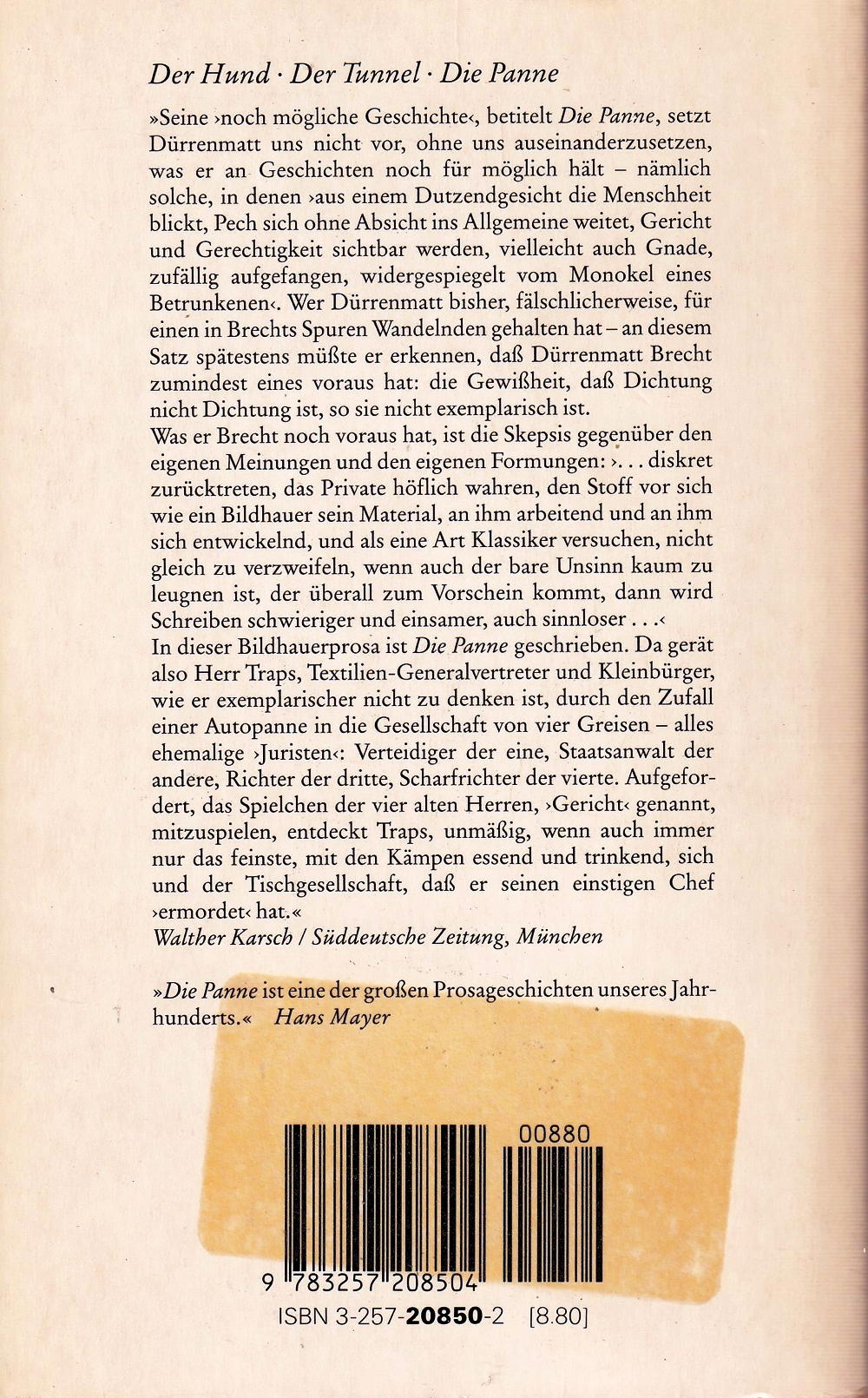 In dieser Bildhauerprosa ist Die Panne geschrieben. Da gerät also Herr Traps, Textilien-Generalvertreter und Kleinbürger, wie er exemplarischer nicht zu denken ist, durch den Zufall einer Autopanne in die Gesellschaft von vier Greisen alles ehemalige Juristen: Verteidiger der eine, Staatsanwalt der andere, Richter der dritte, Scharfrichter der vierte. Aufgefordert, das Spielchen der vier alten Herren, Gericht genannt, mitzuspielen, entdeckt Traps, unmässig, wenn auch immer nur das feinste, mit den Kämpen essend und trinkend, sich und der Tischgesellschaft, dass er seinen einstigen Chef ermordet hat. Walther Karsch /Süddeutsche Zeitung, München