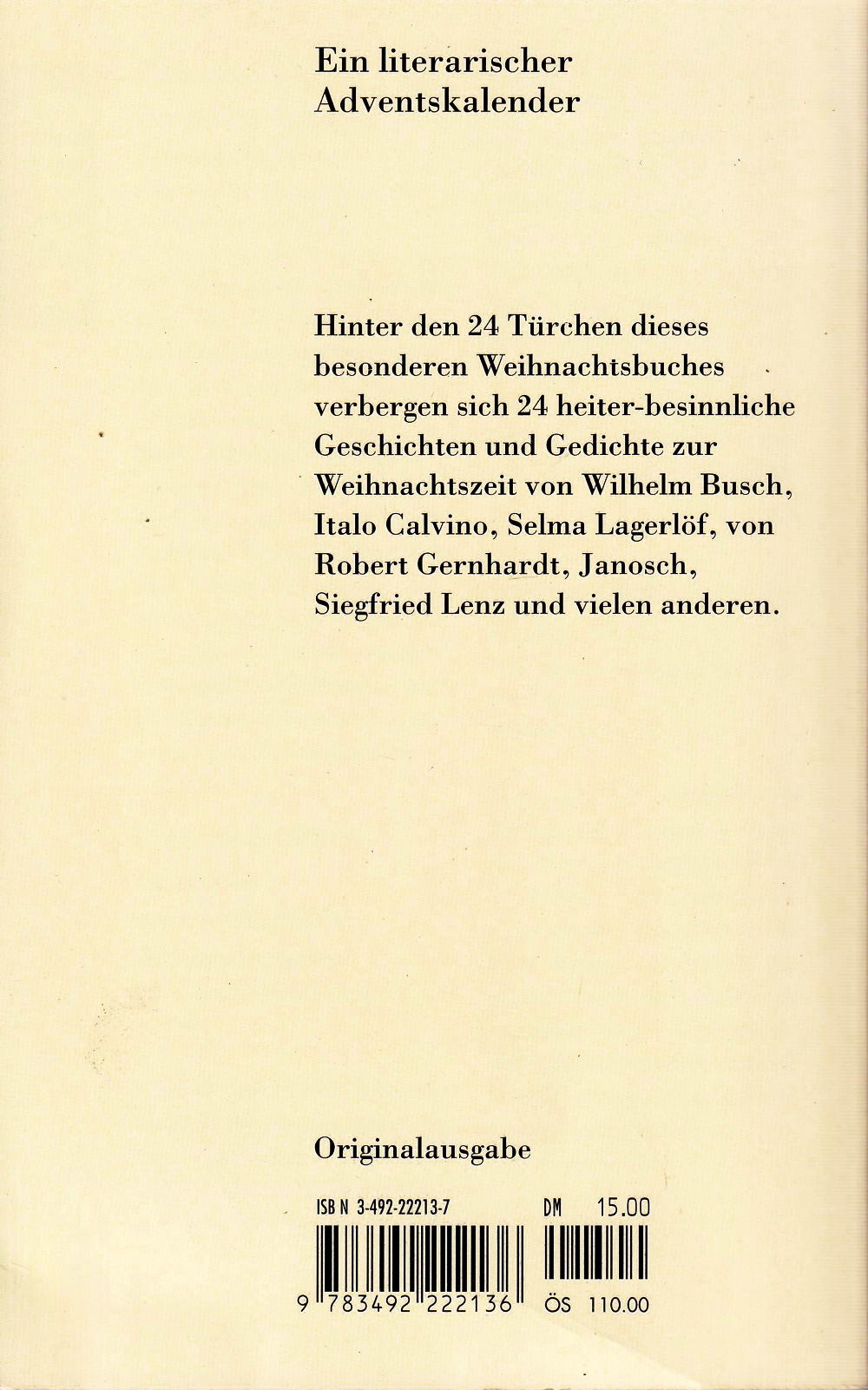 Hinter den 24 Türchen dieses besonderen Weihnachtsbuches verbergen sich 24 heitere und besinnliche Geschichten und Gedichte zur Weihnachtszeit von Wilhelm Busch, Italo Calvino, Selma Lagerlöf, von Ulla Frühling, Janosch, Siegfried Lenz und vielen anderen. – Mit echten Adventstürchen!