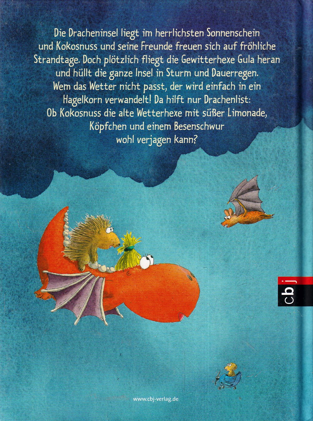 Strahlender Sonnenschein auf der Dracheninsel: Kokosnuss und seine Freunde freuen sich auf herrliche Strandtage. Doch die Gewitterhexe Gula hüllt die ganze Insel in Sturm und Dauerregen. Wem das Wetter nicht passt, wird kurzum in ein Hagelkorn verwandelt! Natürlich will Kokosnuss kein Hagelkorn sein, den Sommer aber will er sich auch nicht verhageln lassen. Da hilft nur Drachenlist. Wie man mit süsser Limonade, Köpfchen und einem Besenschwur eine alte Wetterhexe verjagt, erzählt das neue Abenteuer vom kleinen Drachen Kokosnuss und seinen Freunden.