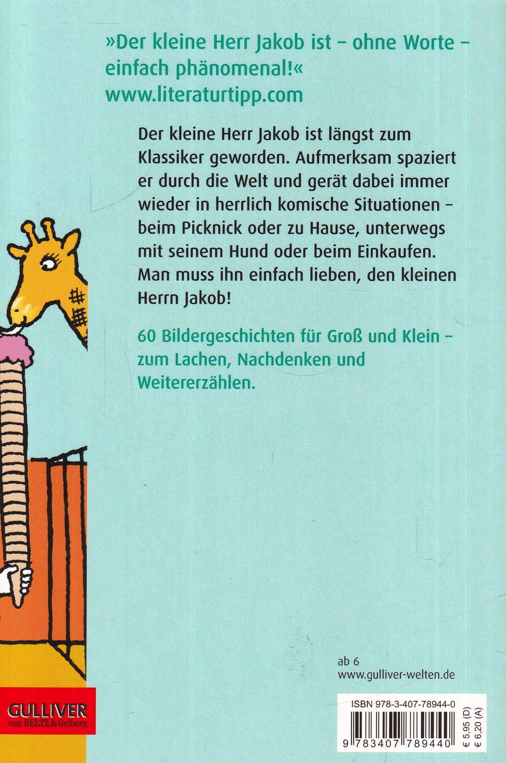 Der kleine Herr Jakob, unverkennbar mit seinem Strubbelbart, Melonenhut und dem Ringelhemd, ist ein liebenswerter und gewitzter Bursche. Ob beim Picknick oder zu Hause, unterwegs mit seinem kleinen Hund oder beim Einkaufen - ständig gerät der kleine