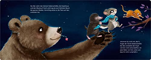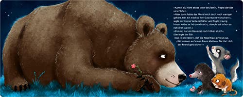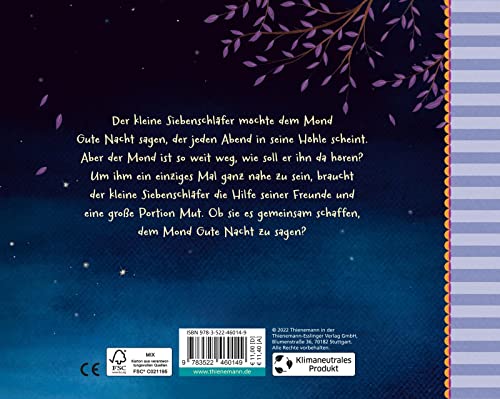 Der 6. Band der erfolgreichen Reihe als stabiles Pappbilderbuch für Kinder ab 2 Jahren. Jeden Abend sagt der kleine Siebenschläfer Gute Nacht zu seiner Mama, seinem Papa und zum grossen, hellen Mond, der Nacht für Nacht in seine Höhle scheint. Doch der Mond antwortet ihm nie. Wie denn auch, wenn er so weit weg ist! Ein einziges Mal will der kleine Siebenschläfer so nah an den Mond kommen, dass er ihm Gute Nacht sagen kann. Zum Glück hat er seine Freunde, die ihm bei diesem abenteuerlichen Unternehmen zur Seite stehen. Ob sie es gemeinsam schaffen, dem Mond Gute Nacht zu sagen?