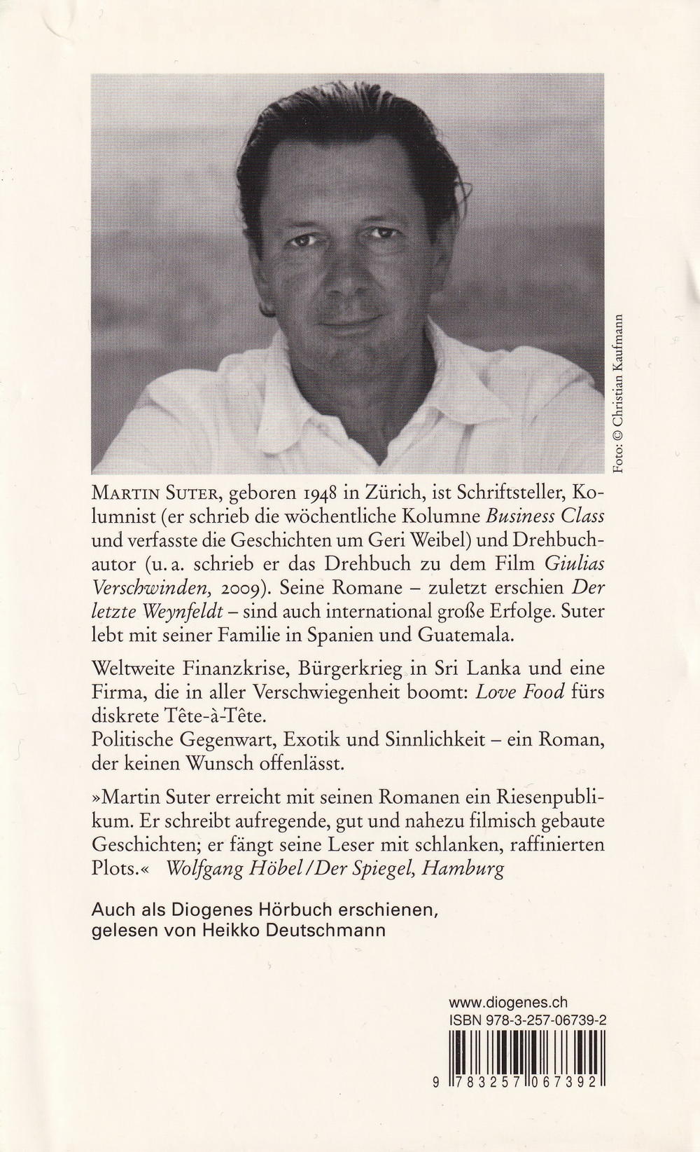 Martin Suter, geboren 1948 in Zürich, lebt mit seiner Frau in Spanien und Guatemala. Er war Werbetexter und erfolgreicher Werber, ein Beruf, den er immer wieder durch andere Schreibtätigkeiten ergänzt oder unterbrochen hat. Unter anderem "GEO"-Reportagen, zahlreiche Drehbücher für Film und Fernsehen. Seit 1991 lebt er als freier Autor, seit 1992 schreibt er die wöchentliche Kolumne "Business Class" in der "Weltwoche".§§Martin Suter ist am 29. März 2004 in Zürich mit der Goldenen Diogenes Eule ausgezeichnet worden.