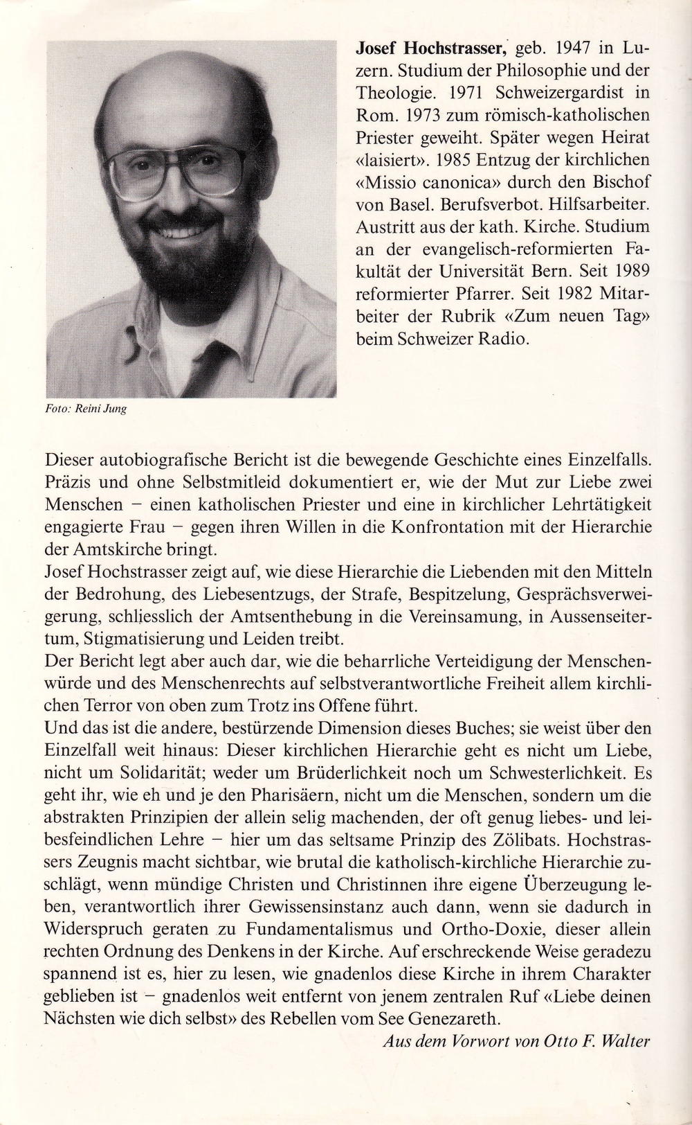 Und das ist die andere, bestürzende Dimension dieses Buches; sie weist über den Einzelfall weit hinaus: Dieser kirchlichen Hierarchie geht es nicht um Liebe, nicht um Solidarität; weder um Brüderlichkeit noch um Schwesterlichkeit. Es geht ihr, wie eh und je den Pharisäern, nicht um die Menschen, sondern um die abstrakten Prinzipien der allein selig machenden, der oft genug liebes- und leibesfeindlichen Lehre hier um das seltsame Prinzip des Zölibats. Hochstrassers Zeugnis macht sichtbar, wie brutal die katholisch-kirchliche Hierarchie zuschlägt, wenn mündige Christen und Christinnen ihre eigene Überzeugung leben, verantwortlich ihrer Gewissensinstanz auch dann, wenn sie dadurch in Widerspruch geraten zu Fundamentalismus und Ortho-Doxie, dieser allein rechten Ordnung des Denkens in der Kirche. Auf erschreckende Weise geradezu spannend ist es, hier zu lesen, wie gnadenlos diese Kirche in ihrem Charakter geblieben ist gnadenlos weit entfernt von jenem zentralen Ruf «Liebe deinen Nächsten wie dich selbst» des Rebellen vom See Genezareth.