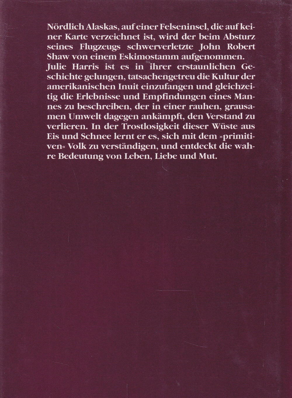 Nördlich Alaskas auf einer Felseninsel. Die auf keiner Karte verzeichnet ist. Wird der beim Absturz seines Flugzeugs schwerverletzte John Robert Shaw von einem Eskimostamm aufgenommen. Julie Harris ist es in ihrer erstaunlichen Geschichte gelungen, tatsachengetreu die Kultur der amerikanischen Inuit einzufangen und gleichzeitig die Erlebnisse und Empfindungen eines Mannes zu beschreiben, der in einer rauen, grausamen Umwelt dagegen ankämpft, den Verstand zu verlieren. In der Trostlosigkeit dieser Wüste aus Eis und Schnee lernt er es, sich mit dem> primitiven Volk zu verständigen, und entdeckt die wahre Bedeutung von Leben, Liebe und Mut.