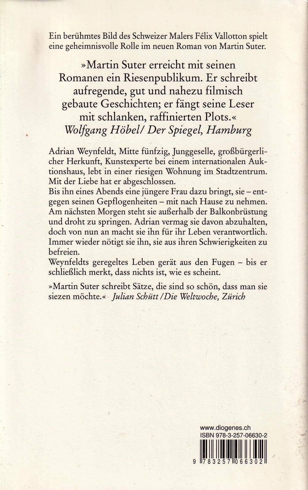 Martin Suter, geboren 1948 in Zürich, lebt mit seiner Frau in Spanien und Guatemala. Er war Werbetexter und erfolgreicher Werber, ein Beruf, den er immer wieder durch andere Schreibtätigkeiten ergänzt oder unterbrochen hat. Unter anderem "GEO"-Reportagen, zahlreiche Drehbücher für Film und Fernsehen. Seit 1991 lebt er als freier Autor, seit 1992 schreibt er die wöchentliche Kolumne "Business Class" in der "Weltwoche".§§Martin Suter ist am 29. März 2004 in Zürich mit der Goldenen Diogenes Eule ausgezeichnet worden.