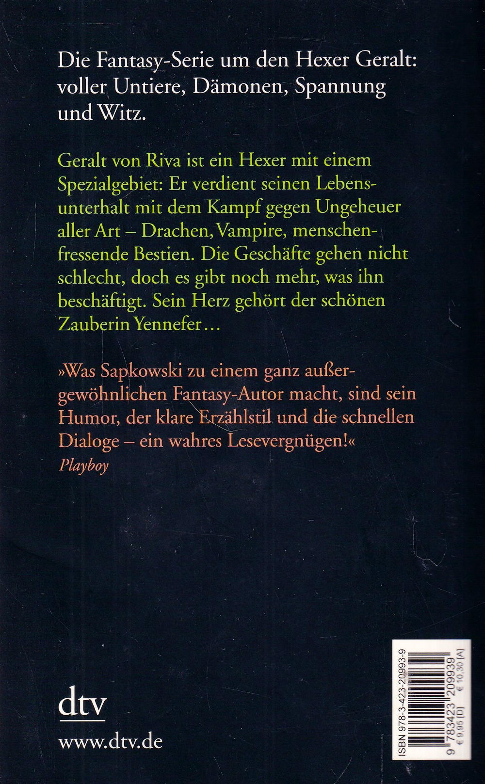 Voller Untiere, Dämonen, Spannung und Witz. Der Hexer Geralt von Riva verdient sein Geld mit Kämpfen gegen Ungeheuer aller Art. Über einen Mangel an Aufträgen kann er sich nicht beklagen, denn es gibt genügend Leute, die dringend Hilfe gegen Vampire, Drachen und andere dämonische Wesen brauchen. Als Geralt eines Tages einen Luftgeist befreit, schlägt ihn dieser mit der verhängnisvollen und quälenden Liebe zu der schönen Zauberin Yennefer. Und dann wird Geralts bester Freund schwer verletzt und braucht seine Hilfe...