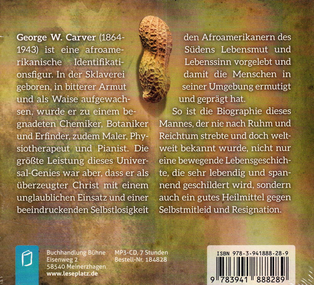George W. Carver (1864-1943) ist eine afroamerikanische Identifikationsfigur. In der Sklaverei geboren, in bitterer Armut und als Waise aufgewachsen, wurde er zu einem begnadeten Chemiker, Botaniker und Erfinder, zudem Maler, Physiotherapeut und Pianist. Die grösste Leistung dieses Universal-Genies war aber, dass er als überzeugter Christ mit einem unglaublichen Einsatz und einer beeindruckenden Selbstlosigkeit den Afroamerikanern des Südens Lebensmut und Lebenssinn vorgelebt und damit die Menschen in seiner Umgebung ermutigt und geprägt hat. So ist die Biographie dieses Mannes, der nie nach Ruhm und Reichtum strebte und doch weltweit bekannt wurde, nicht nur eine bewegende Lebensgeschichte, die sehr lebendig und spannend geschildert wird, sondern auch ein gutes Heilmittel gegen Selbstmitleid und Resignation. Ein Hörbuch nach dem gleichnamigen Buch, gelesen von Daniel Kopp.