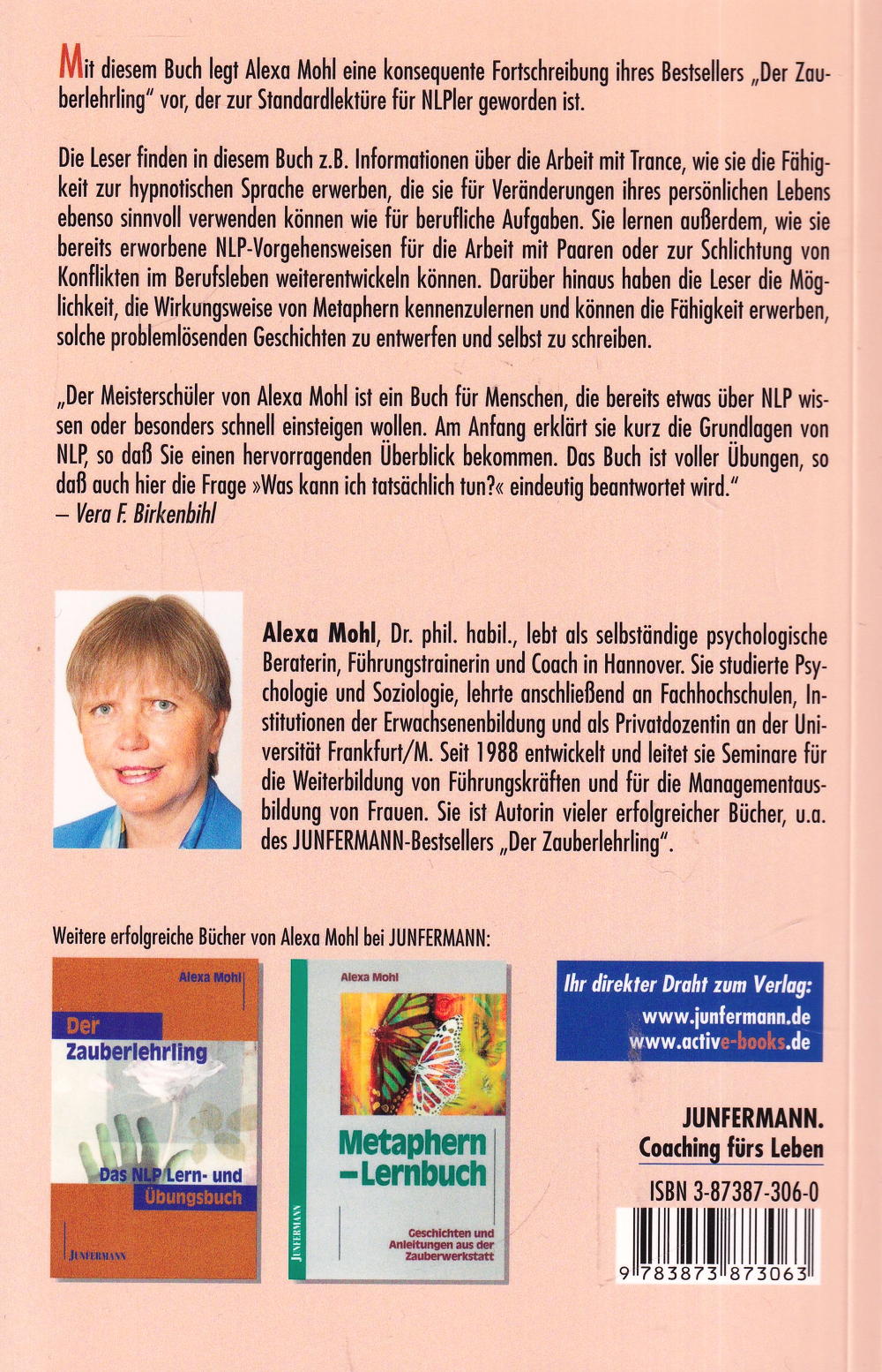 Mit diesem Buch legt Alexa Mohl eine konsequente Fortschreibung ihres Bestsellers "Der Zauberlehrling" vor, der zur Standardlektüre für NLPler geworden ist. Die Leser finden in diesem Buch ein Kapitel über die Arbeit mit Trance, in dem sie die Fähigkeit zur hypnotischen Sprache erwerben, die sie für Veränderungen ihres persönlichen Lebens ebenso sinnvoll verwenden können wie für berufliche Aufgaben. Sie lernen in einem weiteren Kapitel, wie sie bereits erworbene NLP-Vorgehensweisen für die Arbeit mit Paaren oder zur Schlichtung von Konflikten im Berufsleben weiterentwickeln können. Darüber hinaus haben die Leser die Möglichkeit, die Wirkungsweise von Metaphern kennenzulernen und können die Fähigkeit erwerben, solche problemlösenden Geschichten zu entwerfen und selbst zu schreiben. In den beiden letzten Kapiteln finden sich NLP-Vorgehensweisen, die in Deutschland erst in den 1990er-Jahren bekannt wurden, wie Arbeiten mit Bodenankern und mit der Timeline.