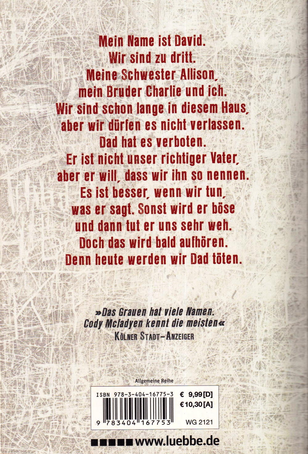 Evolviere! - David starrt den Brief an, in dem nur dieses eine Wort steht, und schon kehren die grausamen Erinnerungen zurück: wie seine alleinstehende Mutter tödlich verunglückte, als er sechs Jahre alt war. Wie er zusammen mit zwei weiteren Kindern von einem Mann adoptiert wurde, den sie "Vater" nennen sollten. Wie dieser seine Adoptivkinder mit Brutalität und Grausamkeit dazu bewegen wollte, zu "evolvieren." Zwanzig Jahre später hat David sich zum angesehenen Schriftsteller entwickelt, doch die Schatten seiner Vergangenheit scheinen nicht ruhen zu wollen. Damals hatten die Kinder einhellig Vaters Tod beschlossen und sind ein grosses Wagnis eingegangen. Hat Vater überlebt? Beginnt der Albtraum für David von Neuem? Cody Mcfadyen beweist mit diesem brutalen, emotionalen Thriller wahre Erzählkunst.