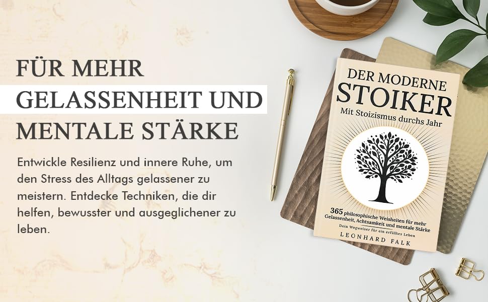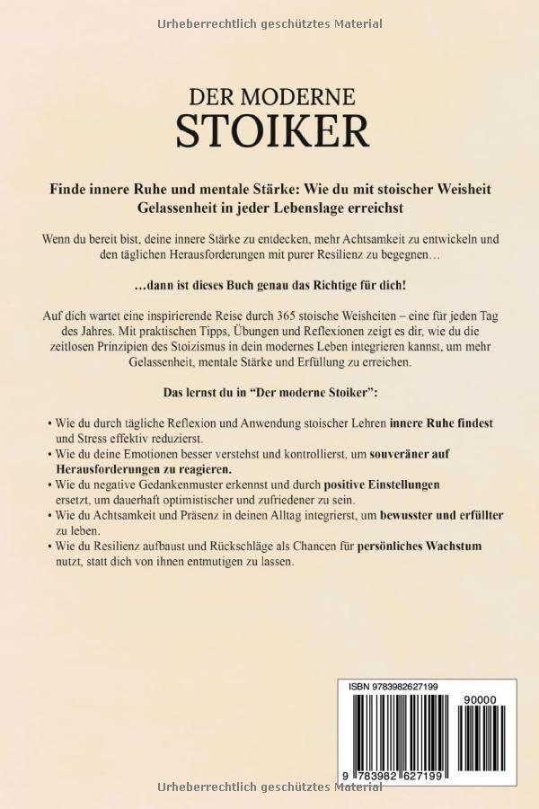 Dieses Buch begleitet dich auf einer inspirierenden Reise durch 365 stoische Weisheiten – eine für jeden Tag des Jahres. Mit praktischen Tipps, Übungen und Reflexionen zeigt es dir, wie du die zeitlosen Prinzipien des Stoizismus in dein modernes Leben integrieren kannst, um mehr Gelassenheit, mentale Stärke und Erfüllung zu erreichen. Das lernst du in diesem inspirierenden Buch: Wie du durch tägliche Reflexion und Anwendung stoischer Lehren innere Ruhe findest und Stress effektiv reduzierst. Wie du deine Emotionen besser verstehst und kontrollierst, um souveräner auf Herausforderungen zu reagieren. Wie du negative Gedankenmuster erkennst und durch positive Einstellungen ersetzt, um dauerhaft optimistischer und zufriedener zu sein. Wie du Achtsamkeit und Präsenz in deinen Alltag integrierst, um bewusster und erfüllter zu leben. Wie du Resilienz aufbaust und Rückschläge als Chancen für persönliches Wachstum nutzt, statt dich von ihnen entmutigen zu lassen. Erlebe die drei wichtigsten Vorteile von Der moderne Stoiker: …MENTALE STÄRKE ENTWICKELN: Durch die tägliche Auseinandersetzung mit stoischen Weisheiten stärkst du deine innere Widerstandsfähigkeit. Du lernst, gelassener mit Stress umzugehen und behältst auch in schwierigen Situationen einen klaren Kopf. …GELASSENHEIT IM ALLTAG: Die praktischen Übungen und Tipps helfen dir, innere Ruhe zu finden und deine Emotionen zu balancieren. So kannst du den täglichen Herausforderungen mit mehr Leichtigkeit und Zuversicht begegnen. …PERSÖNLICHES WACHSTUM FÖRDERN: Durch Selbstreflexion und die Umsetzung stoischer Prinzipien entwickelst du dich kontinuierlich weiter. Du gewinnst neue Perspektiven und gestaltest dein Leben bewusster und erfüllter. Stell dir jetzt vor, …