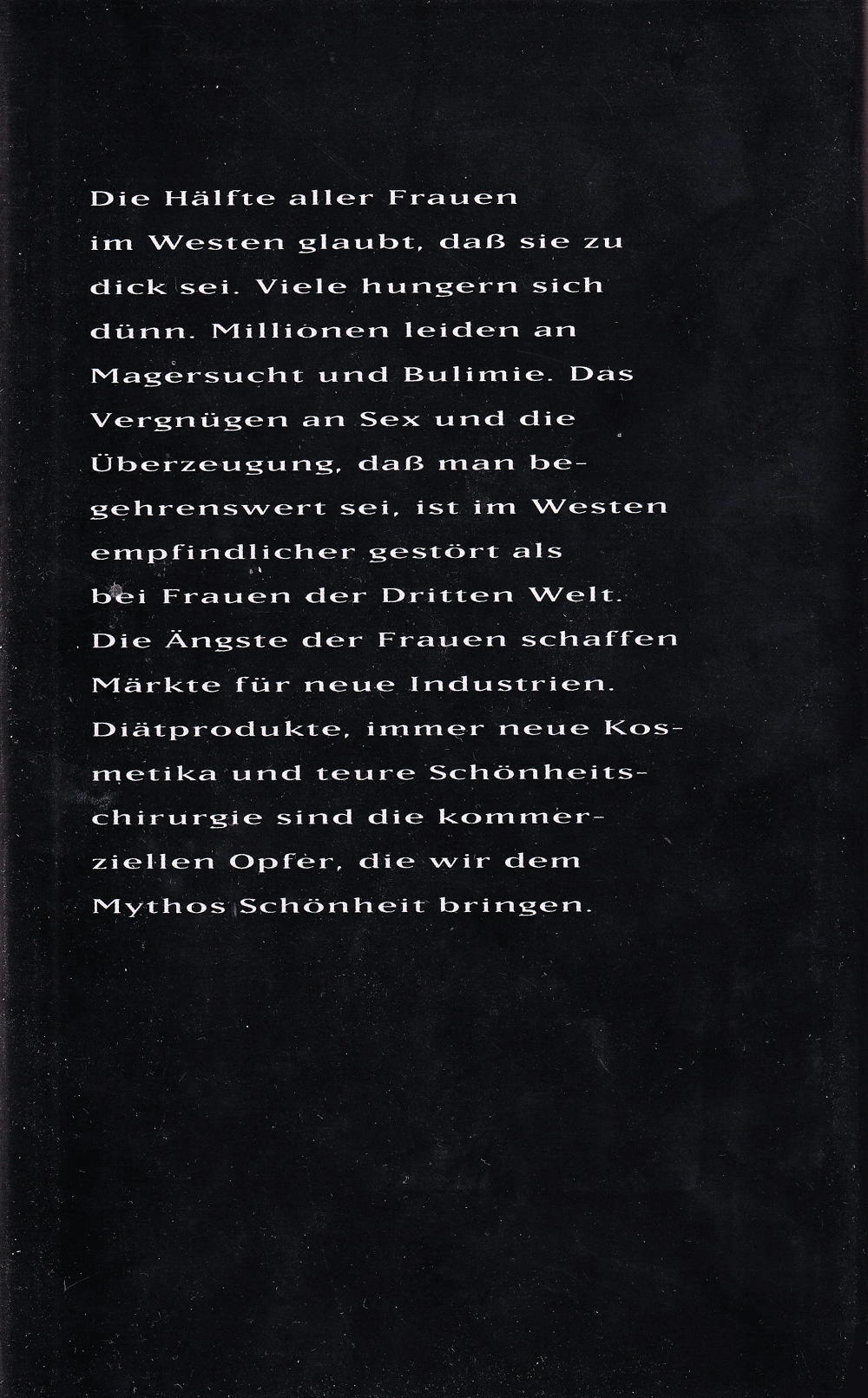 Die Hälfte aller Frauen im Westen glaubt, daB sie zu dick sei. Viele hungern sich dünn. Millionen leiden an Das Magersucht und Bulimie. Das Vergnügen an Sex und die Überzeugung, dass man begehrenswert sei, ist im Westen empfindlicher gestört als bei Frauen der Dritten Welt. Die Ängste der Frauen schaffen Märkte für neue Industrien. Diätprodukte, immer neue Kosmetika und teure Schönheitschirurgie sind die kommerziellen Opfer, die wir dem Mythos Schönheit bringen.