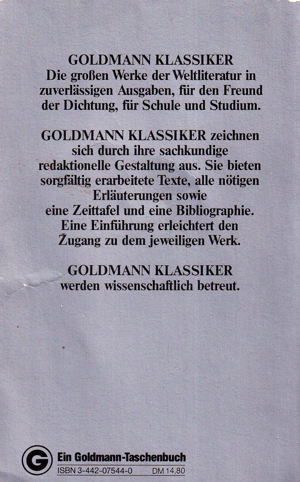 GOLDMANN KLASSIKER Die grossen Werke der Weltliteratur in zuverlässigen Ausgaben, für den Freund der Dichtung, für Schule und Studium.