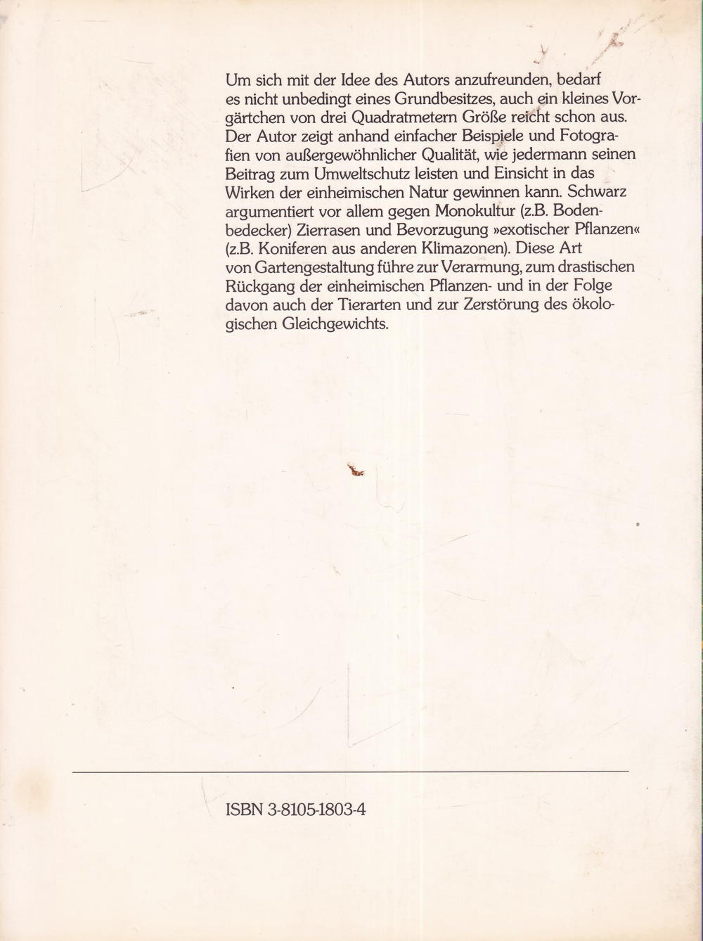 Der Autor zeigt anhand einfacher Beispiele und Fotografien von aussergewöhnlicher Qualität, wie jedermann seinen Beitrag zum Umweltschutz leisten und Einsicht in das Wirken der einheimischen Natur gewinnen kann. Schwarz argumentiert vor allem gegen Monokultur (z. B. Bodenbedecker) Zierrasen und Bevorzugung »exotischer Pflanzen«
