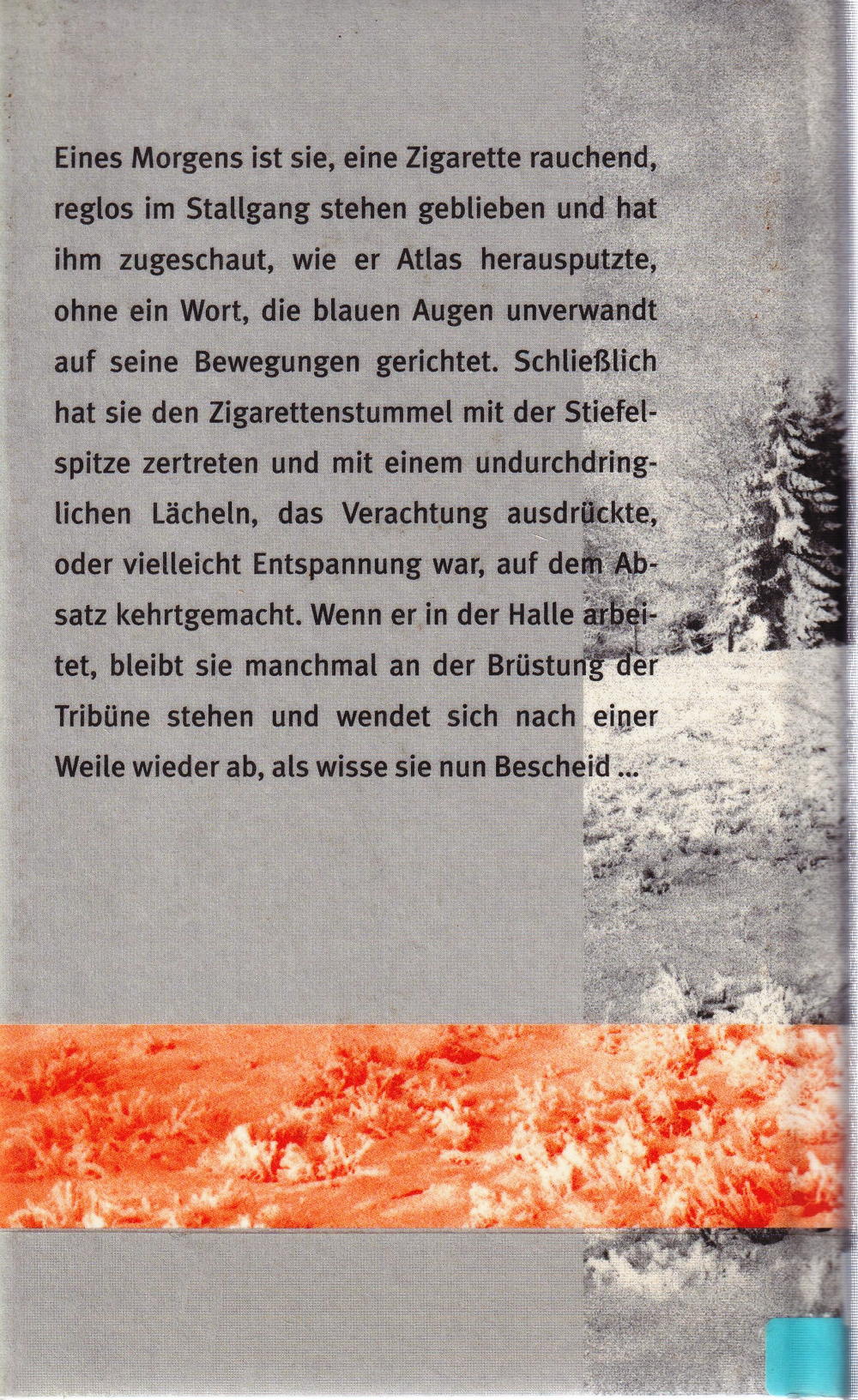 Eines Morgens ist sie, eine Zigarette rauchend, reglos im Stallgang stehen geblieben und hat ihm zugeschaut, wie er Atlas herausputzte, ohne ein Wort, die blauen Augen unverwandt auf seine Bewegungen gerichtet. Schliesslich hat sie den Zigarettenstummel mit der Stiefelspitze zertreten und mit einem undurchdringlichen Lächeln, das Verachtung ausdrückte, oder vielleicht Entspannung war, auf dem Absatz kehrtgemacht. Wenn er in der Halle arbeitet, bleibt sie manchmal an der Brüstung der Tribüne stehen und wendet sich nach einer Weile wieder ab, als wisse sie nun Bescheid.