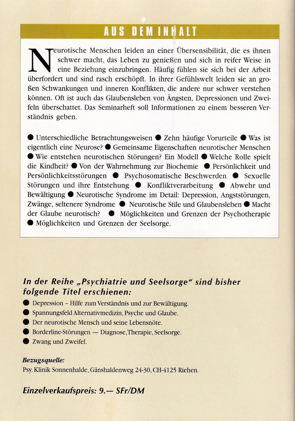 Neurotische Menschen leiden an einer Übersensibilität, die es ihnen schwer macht, das Leben zu geniessen und sich in reifer Weise in eine Beziehung einzubringen. Häufig fühlen sie sich bei der Arbeit überfordert und sind rasch erschöpft. In ihrer Gefühlswelt leiden sie an grossen Schwankungen und inneren Konflikten, die andere nur schwer verstehen können. Oft ist auch das Glaubensleben von Ängsten, Depressionen und Zweifeln überschattet. Das Seminarheft soll Informationen zu einem besseren Verständnis geben.