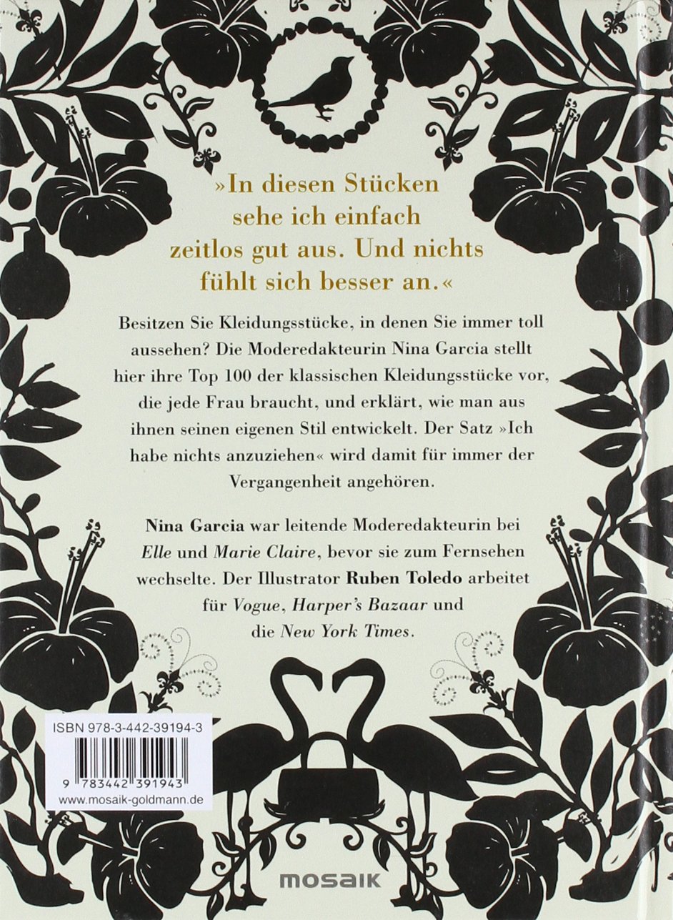 Besitzen Sie Kleidungsstücke, in denen Sie immer toll aussehen? Oder nur Fehlkäufe? Die Moderedakteurin Nina Garcia erklärt charmant-gewitzt, was ihre Top 100 der klassischen Kleidungsstücke sind, die jede Frau braucht, und wie man aus diesen seinen eigenen Stil entwickelt. Als Einkaufsführer sowie Bezugssystem ist diese Liste ein Leitfaden, ein Barometer von Modeartikeln, die der Zeit sowie den Trends getrotzt haben.