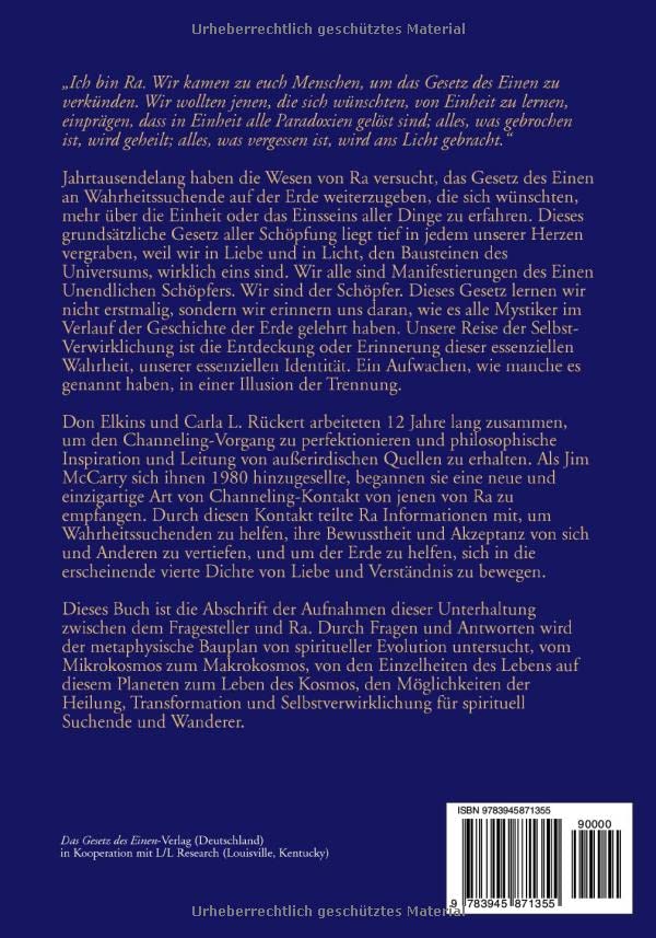 Jahrtausendelang haben die Wesen von Ra versucht, das Gesetz des Einen an Wahrheitssuchende auf der Erde weiterzugeben, die sich wünschten, mehr über die Einheit oder das Einsseins aller Dinge zu erfahren. Dieses grundsätzliche Gesetz aller Schöpfung liegt tief in jedem unserer Herzen vergraben, weil wir in Liebe und in Licht, den Bausteinen des Universums, wirklich eins sind. Wir alle sind Manifestierungen des Einen Unendlichen Schöpfers. Wir sind der Schöpfer. Dieses Gesetz lernen wir nicht erstmalig, sondern wir erinnern uns daran, wie es alle Mystiker im Verlauf der Geschichte der Erde gelehrt haben. Unsere Reise der Selbstverwirklichung ist die Entdeckung oder Erinnerung dieser essenziellen Wahrheit, unserer essenziellen Identität. Ein Aufwachen, wie manche es genannt haben, in einer Illusion der Trennung. Don Elkins und Carla L. Rückert arbeiteten 12 Jahre lang zusammen, um den Channelingvorgang zu perfektionieren und philosophische Inspiration und Leitung von ausserirdischen Quellen zu erhalten. Als Jim McCarty sich ihnen 1980 anschloss, begannen sie eine neue und einzigartige Art von Kontakt mit Ra zu empfangen. Durch diesen Kontakt teilte Ra Informationen mit, um Wahrheitssuchenden zu helfen, ihre Bewusstheit und Akzeptanz von sich und Anderen zu vertiefen, und um der Erde zu helfen, sich in die erscheinende vierte Dichte von Liebe und Verständnis zu bewegen. Dieses Buch ist die Abschrift der Aufnahmen dieser Unterhaltung zwischen dem Fragesteller (Don Elkins) und Ra. Durch Fragen und Antworten wird der metaphysische Bauplan von spiritueller Evolution untersucht, vom Mikrokosmos zum Makrokosmos, von den Einzelheiten des Lebens auf diesem Planeten zum Leben des Kosmos, und den darin enthaltenen Möglichkeiten der Heilung, Transformation und Selbstverwirklichung für spirituell Suchende und Wanderer.
