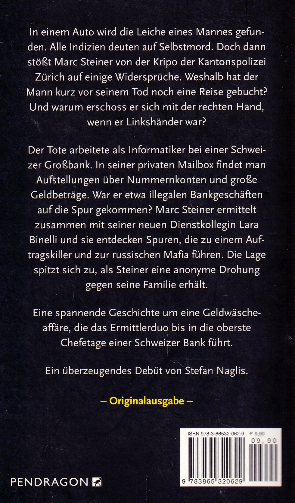 In einem Auto wird die Leiche eines Mannes gefunden. Alle Indizien deuten auf Selbstmord. Doch dann stösst Marc Steiner von der Kripo der Kantonspolizei Zürich auf einige Widersprüche. Weshalb hat der Mann kurz vor seinem Tod noch eine Reise gebucht? Und warum erschoss er sich mit der rechten Hand, wenn er Linkshänder war? Der Tote arbeitete als Informatiker bei einer Schweizer Grossbank. In seiner privaten Mailbox findet man Aufstellungen über Nummernkonten und grosse Geldbeträge. War er etwa illegalen Bankgeschäften auf die Spur gekommen? Marc Steiner ermittelt zusammen mit seiner neuen Dienstkollegin Lara Binelli und sie entdecken Spuren, die zu einem Auftragskiller und zur russischen Mafia führen. Die Lage spitzt sich zu, als Steiner eine anonyme Drohung gegen seine Familie erhält. Eine spannende Geschichte um eine Geldwäscheaffäre, die das Ermittlerduo bis in die oberste Chefetage einer Schweizer Bank führt.