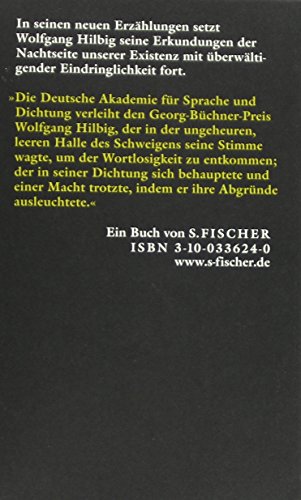 Wolfgang Hilbig, geboren 1941 in Meuselwitz bei Leipzig, gestorben 2007 in Berlin, übersiedelte 1985 aus der DDR in die Bundesrepublik. Er erhielt zahlreiche literarische Auszeichnungen, darunter den Georg-Büchner-Preis, den Ingeborg-Bachmann-Preis, den Bremer Literaturpreis, den Berliner Literaturpreis, den Literaturpreis des Landes Brandenburg, den Lessing-Preis, den Fontane-Preis, den Stadtschreiberpreis von Frankfurt-Bergen-Enkheim, den Peter-Huchel-Preis und den Erwin-Strittmatter-Preis. Im S. Fischer Verlag erscheint die siebenbändige Ausgabe seiner Werke, »eine der wichtigsten Werkausgaben der deutschsprachigen Gegenwartsliteratur« (Uwe Schütte, Wiener Zeitung). Wolfgang Hilbig