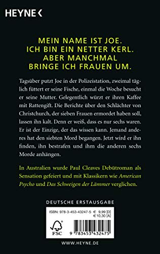 Mein Name ist Joe. Ich bin ein netter Kerl. Aber manchmal bringe ich Frauen um. Joe hat sein Leben scheinbar fest im Griff - tagsüber jobbt er als Putzmann bei der Polizei, abends geht er anderen Tätigkeiten nach. Er denkt daran, seine Fische zweimal täglich zu füttern und seine Mutter mindestens einmal pro Woche zu besuchen, obwohl er ihren Kaffee ab und zu mit Rattengift verfeinert. Er stört sich kaum an den Nachrichten über den Schlächter von Christchurch, der - so wird behauptet - sieben Frauen umgebracht hat. Joe weiss, dass der Schlächter nur sechs getötet hat. Er weiss es ganz einfach. Und Joe wird diesen Nachahmer finden; er wird ihn für die eine Tat bestrafen und ihm die anderen sechs Morde anhängen. Ein perfekter Plan, denn er weiss bereits, dass er die Polizei überlisten kann. Das Einzige, was noch getan werden muss, ist, sich um all die Frauen zu kümmern, die nicht aufhören, ihm im Weg zu stehen.