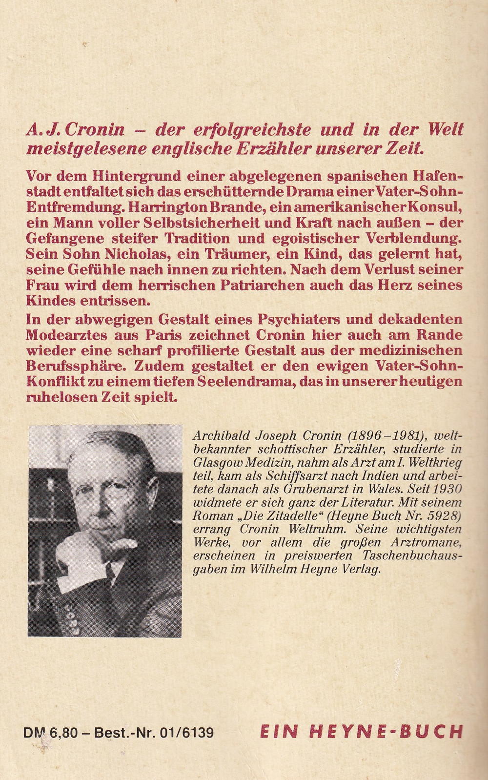 In der abwegigen Gestalt eines Psychiaters und dekadenten Modearztes aus Paris zeichnet Cronin hier auch am Rande wieder eine scharf profilierte Gestalt aus der medizinischen Berufssphäre. Zudem gestaltet er den ewigen Vater-Sohn-Konflikt zu einem tiefen Seelendrama, das in unserer heutigen ruhelosen Zeit spielt.