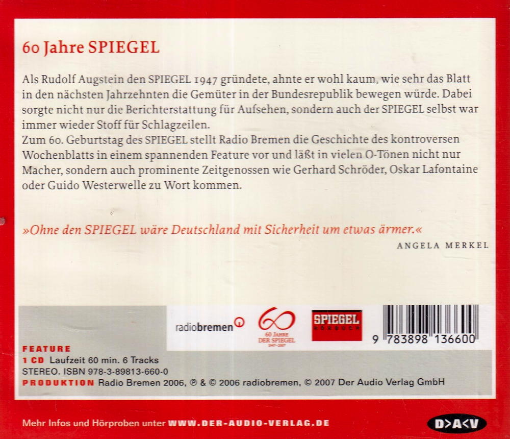 Als Rudolf Augstein den SPIEGEL 1947 gründete, ahnte er wohl kaum, wie sehr das Blatt in den nächsten Jahrzehnten die Gemüter in der Bundesrepublik bewegen würde. Dabei sorgte nicht nur die Berichterstattung für Aufsehen, sondern auch der SPIEGEL selbst war immer wieder Stoff für Schlagzeilen. Zum 60. Geburtstag des SPIEGEL stellt Radio Bremen die Geschichte des kontroversen Wochenblatts in einem spannenden Feature vor und lässt in vielen O-Tönen nicht nur Macher, sondern auch prominente Zeitgenossen wie Gerhard Schröderm Oskar Lafontaine oder Guido Westerwelle zu Wort kommen.