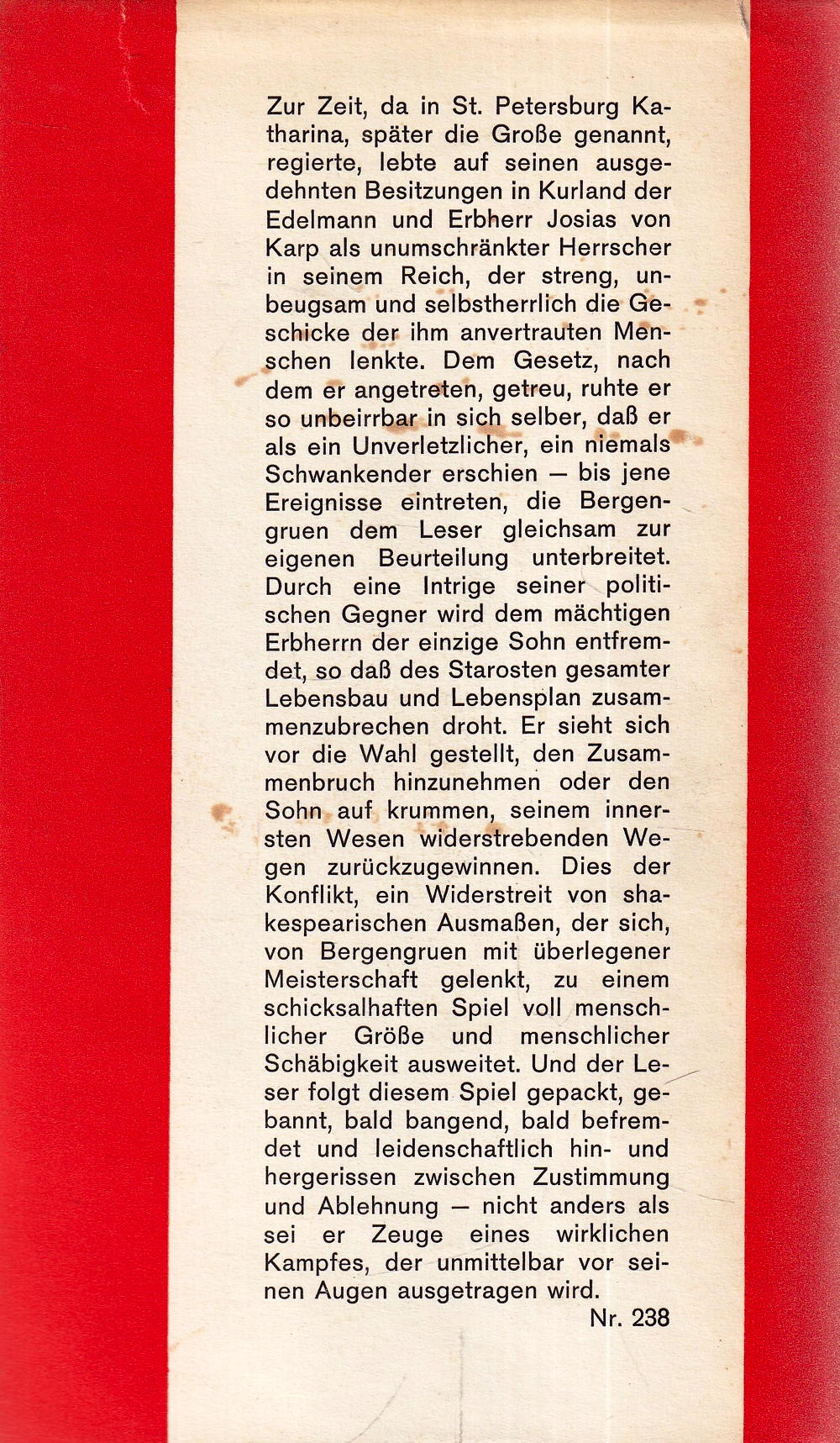 Durch eine Intrige seiner politischen Gegner wird dem mächtigen Erbherrn der einzige Sohn entfremdet, so dass des Starosten gesamter Lebensbau und Lebensplan zusammenzubrechen droht. Er sieht sich vor die Wahl gestellt, den Zusammenbruch hinzunehmen oder den Sohn auf krummen, seinem innersten Wesen widerstrebenden Wegen zurückzugewinnen. Dies der Konflikt, ein Widerstreit von shakespearischen Ausmassen, der sich, von Bergengruen mit überlegener Meisterschaft gelenkt, zu schicksalhaften Spiel voll menschlicher Grösse einem und menschlicher Schäbigkeit ausweitet. Und der Leser folgt diesem Spiel gepackt, gebannt, bald bangend, bald befremdet und leidenschaftlich hin- und hergerissen zwischen Zustimmung und Ablehnung sei - nicht anders als er Zeuge eines wirklichen Kampfes, der unmittelbar vor seinen Augen ausgetragen wird.